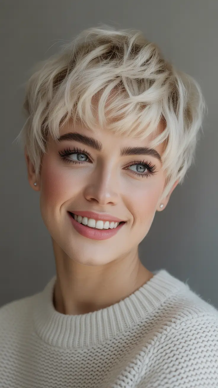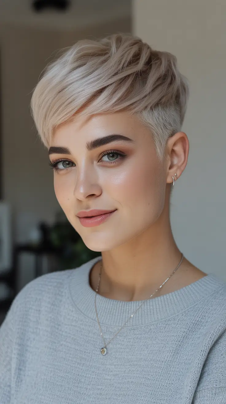 An icy pixie cut that says Fierce, but keep the soft. This icy-blonde pixie pulls the sides up and in, letting a longer, side-swept top drape diagonally to invent cheekbones out of thin winter light. The nearly-bleach detail creates the illusion of dimension, so you wake up and the illusion of control is still in charge. Spark it higher with a light spray of volume mousse at the crown, then let the side-sweep work to keep the temples chic, the eyes wider and sharper. This is the “okay, no hats” cut for the season you refuse to give in to hat-hair.