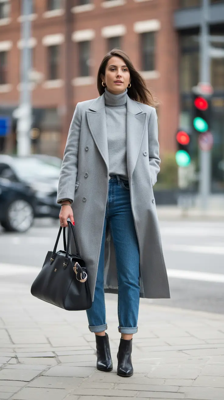 What makes the outfit effortless yet elevated is the pre-packed mental checklist: a brushed-wool coat for air-sliced warmth, a turtleneck engineered to recover shape and hug the neckline upright, and ankle boots tailored with a slender shaft that shows just enough cuff. Textures here stay in the same color family, drapey knits meet firm coat wool and soft denim blend, and that subtle play lets the grey read three-dimensionally, a clever little tool I learned from minimal editors who swear that winter belongs to tonal layers.