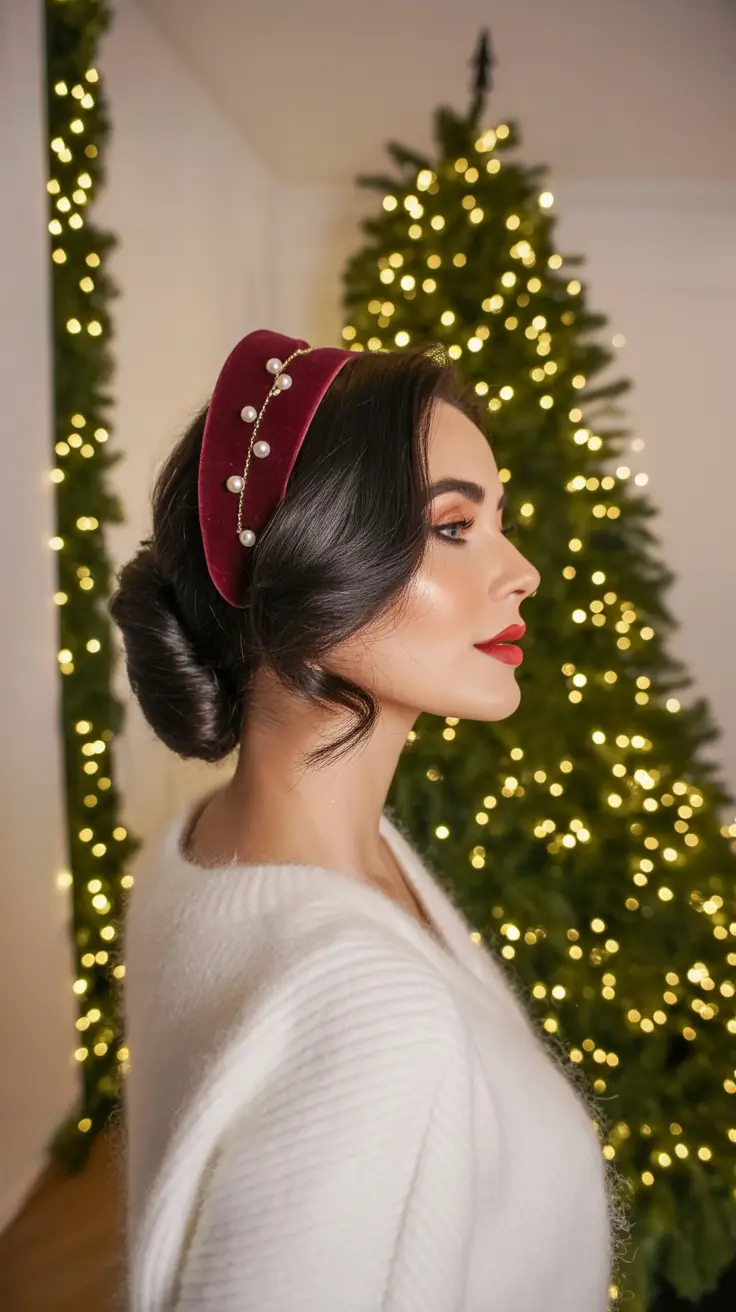 A sleek low chignon coupled with a velvet, pearl studded headband is an immediate party authority. The model has a very tight nape, a gentle bun on the back of the head with a clean side part, which suits most faces. It touches down in Updo land and is ideal one of those christmas hair easy ideas of Women with Medium length hair who desires something classy and contemporary, rapid.
