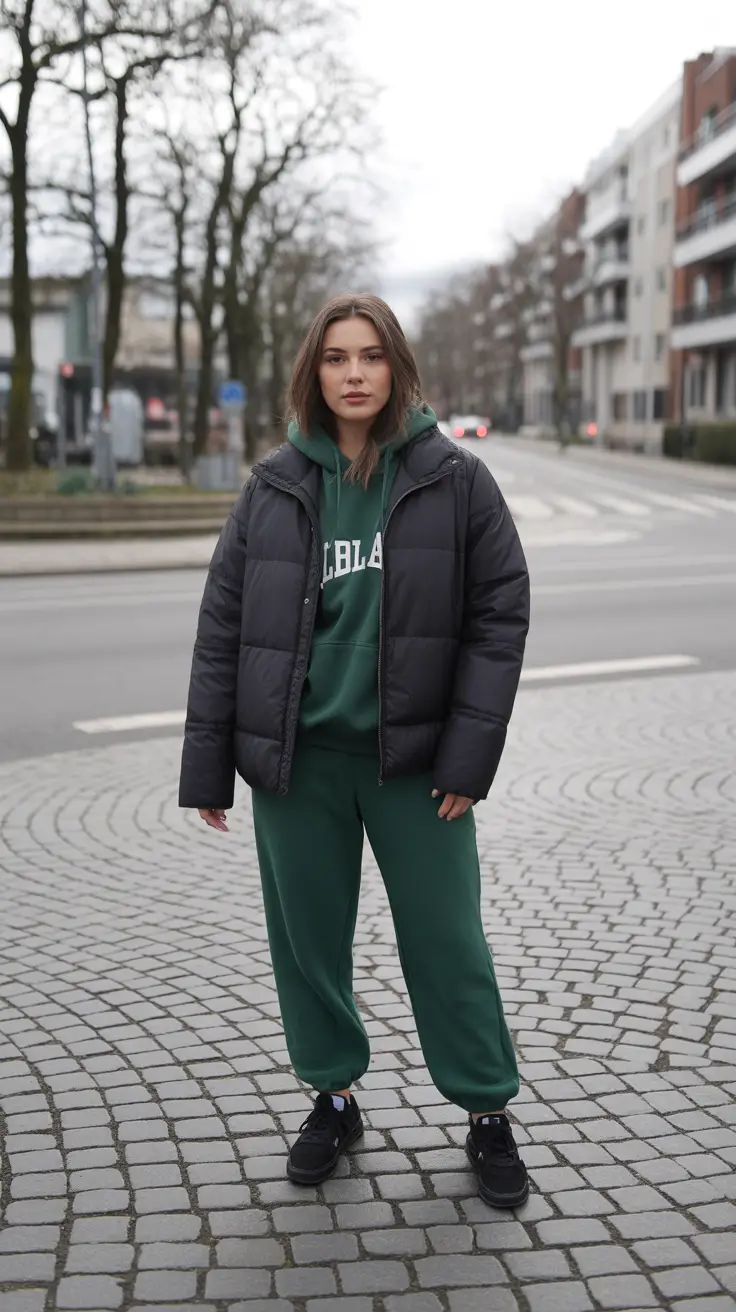 Picture a sleek black puffer draped over a deep forest-green hoodie, with matching sweatpants and classic black sneakers—effortless and heated all in one. This is the Lazy Days uniform for sub-nippy morning strolls, airport layover marathons, or the casual grocery sweep. The same-colored set and the puffer say I’ve got a plan, I just don’t look like I’m working on one.