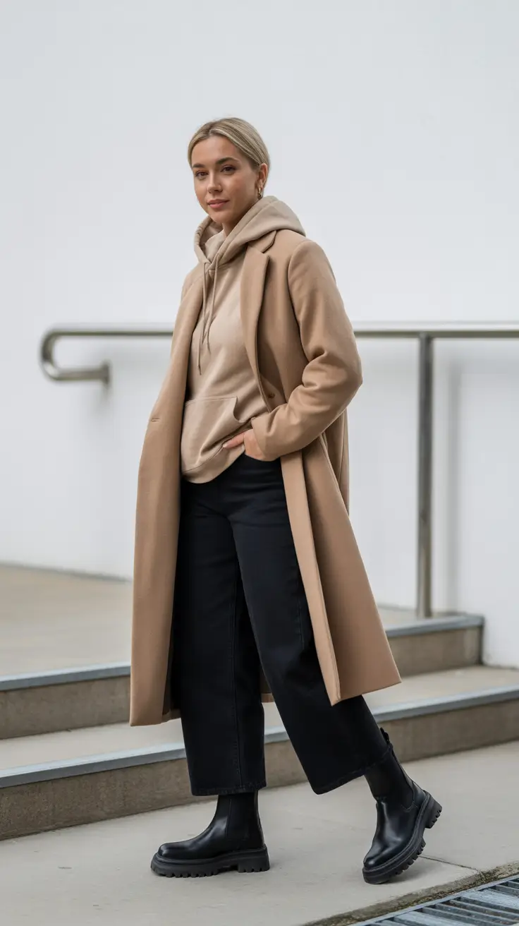 Camel Coat Over Hoodie, Street-Smart Neutral Mix
