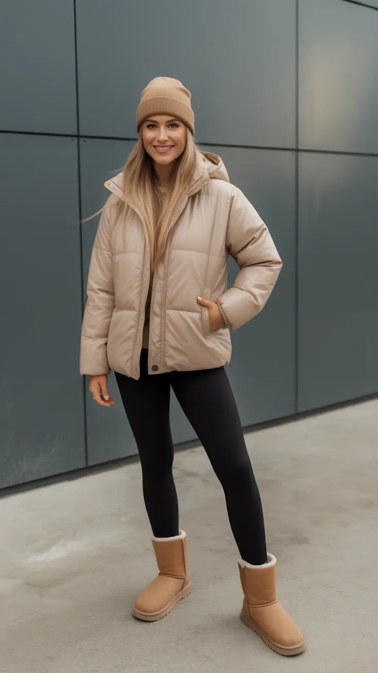 Beige Puffer, Leggings, and Cozy Shearling Boots