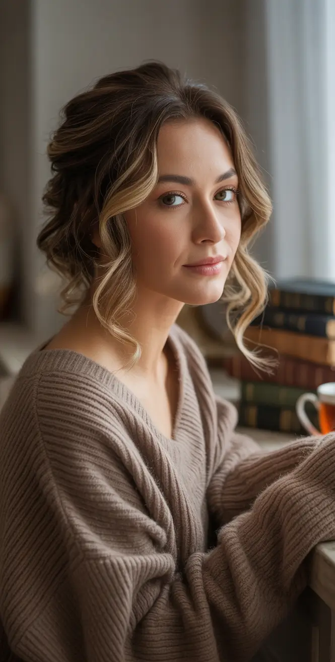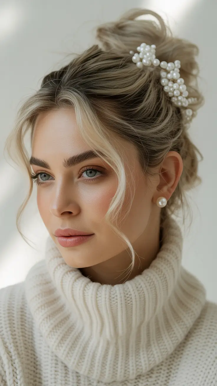 Instant glam that still works with chunky sweaters is achieved through the use of a relaxed clockwise swirl. The topknot is secured with pearly pins, while the soft tendrils are left to skim the cheeks. This pompadour is high, so it elongates the face while the ends are protected from friction, which is a way to be smart in brittle months. This is gold for winter parties, and for cute, easy winter hairstyles that flatter medium to long hair, it does not take a lot of time to prepare.
