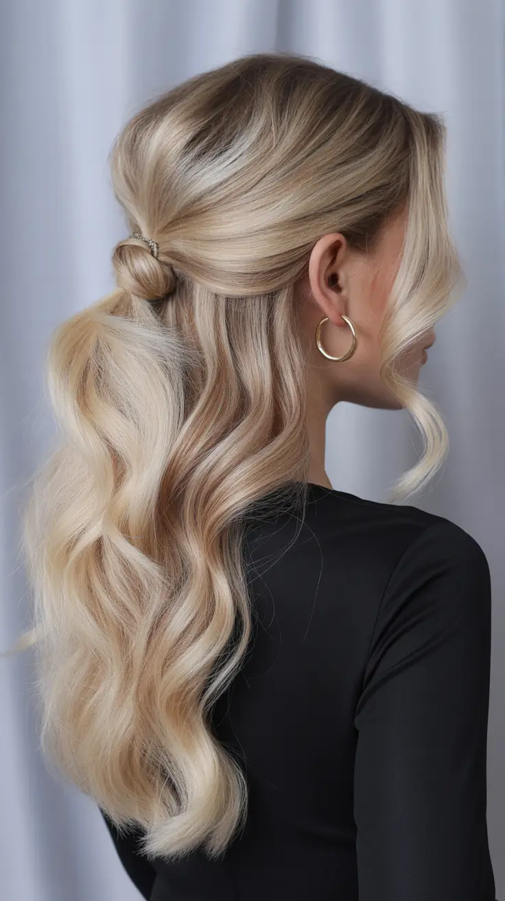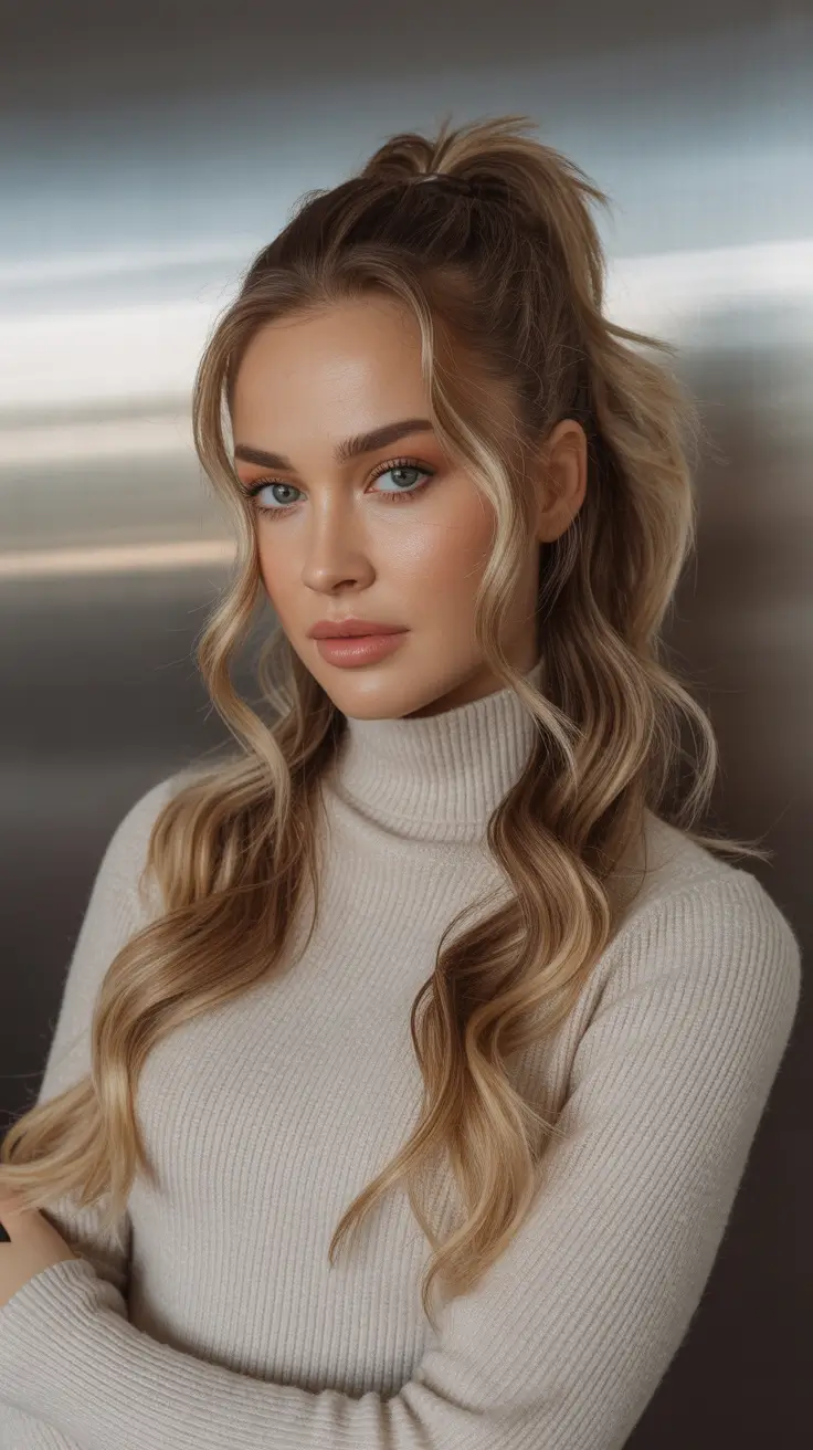 On days I wear a longer hairstyle, a half-up high pony with soft waves feels a little more fun. I keep the hair above the pony high at the crown and let the lengths fall loose ribbons. The front pieces frame the face nicely and softly part which is super cute. It’s a go-to example of cute winter hairstyles for long hair and works for Long hair lovers who want something Easy and face-lifting.