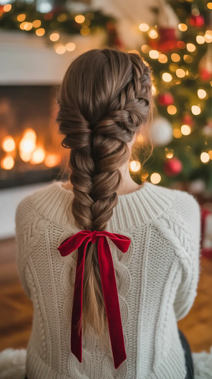 The elegant pull-through braid which extends down the center of the back is beautifully finished with a festive bow made of a red velvet ribbon. The ribbon is bun like since the braid is done with bands. This results in a fuller braid since the bands take the place of intricate weaving. This is an ideal winter hairstyle for those who want to wear it with knitwear. Winter hairstyles for long hair can be done in a short amount of time; for those who still want some extra flair, this hairstyle will give you the best of both worlds.