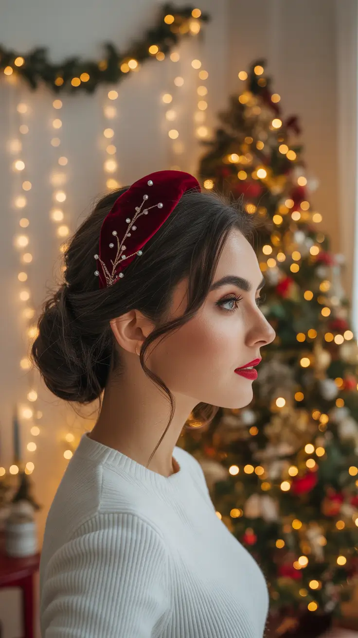 If you want more shine, slide two crystal pins just above the bun or wear a jewel-tone band that matches your lipstick. It’s festive without going full glitter – a wink, not a shout.