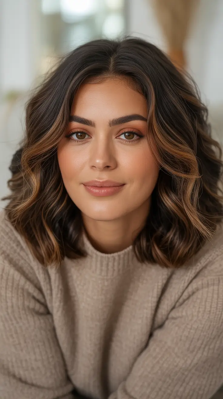 This incision is in that contemporary shallow area not too short and not too long having layers that promote texture and gentle curves. It is done in deep brunette, however, what makes it stand out are the golden face-framing sections and light touches across the top, near perfect beams of light. It is such a pretty example of hair color ideas of dark brown colors fall, as the warmth really mixes with cozy knits and makeup tones. The general influence is easy and casually careless, without too much Dimension to make things bewitching.