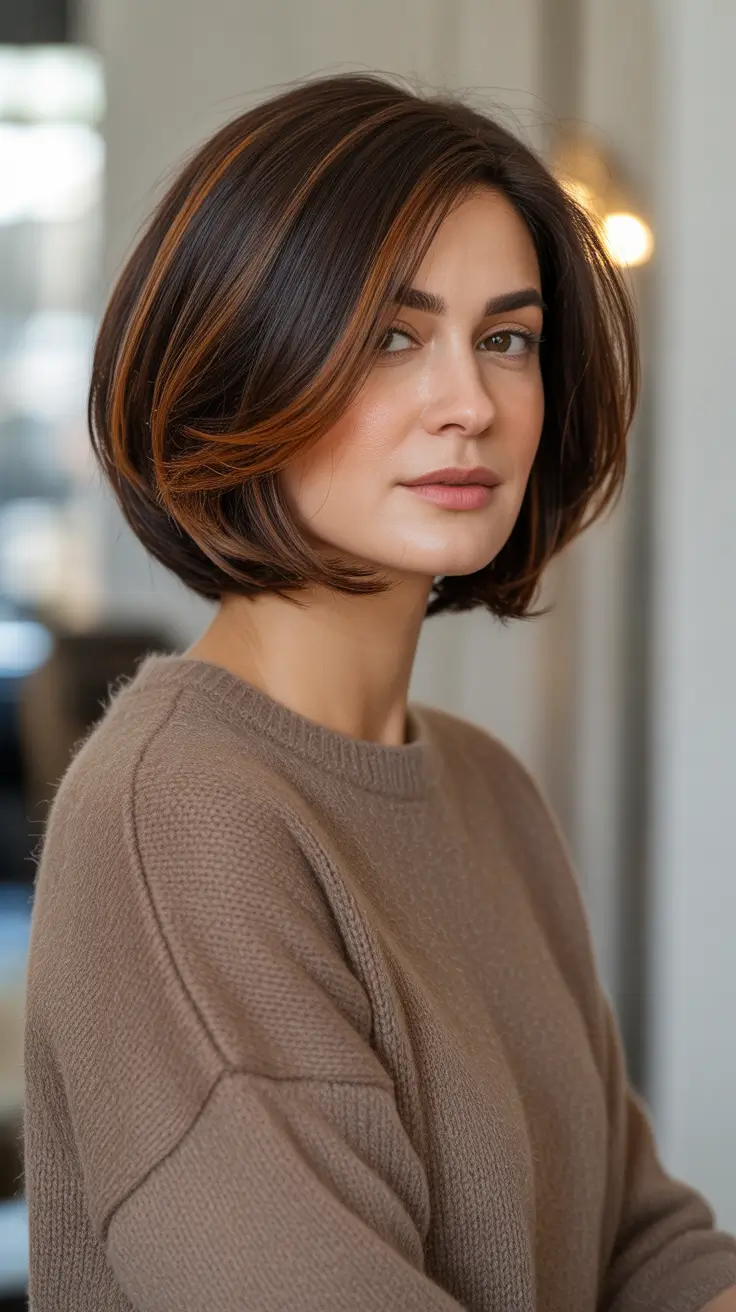 This incision is well at the level of the jaw, and its shape is in the form of a rounded bob, which curves in a little toward the neck. It is a shallow deep glossy brunette, and is overlaid with threads of ultra-fine copper veils, threaded through the top and front parts. The copper, however, is not seen in highlight, but in soft glimpses as the hair moves, making a delicate game of warm Shades on the warmer foundation. The make is sleek and polished, with the most minimal curve at the extremities, which makes it whole modern and not overdone.