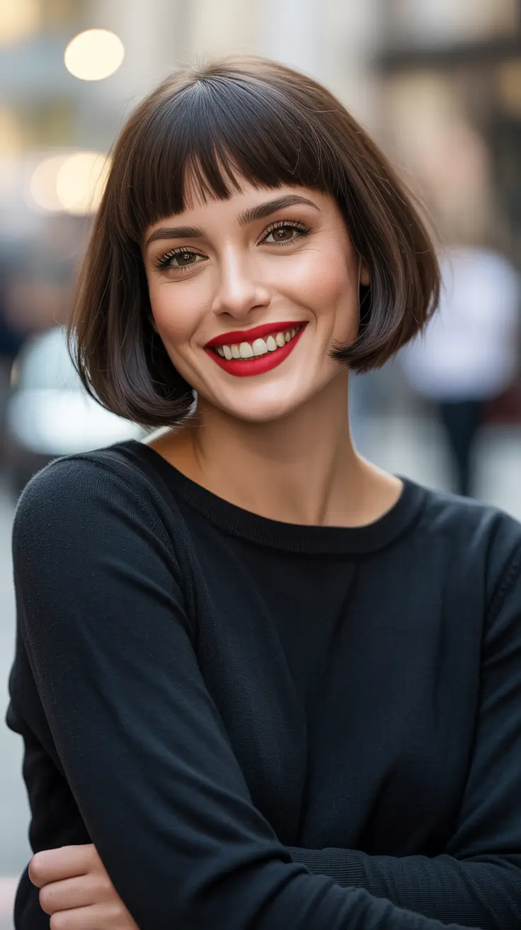 I adore how this bob dances with chunky winter knits and snug high collars—the micro fringe sits like liquid liner, highlighting the brow. For deep winter skin, keep that hair graphite-cool, skipping any warm, caramel fade to the ends. Sleek yet soft is the vibe we want.