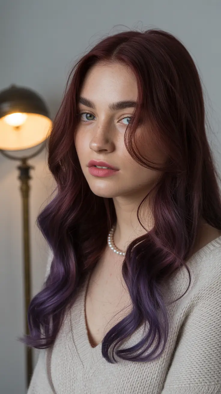 A deep aubergine crown spills into smoky-lavender ends, softly finished with a fringe that makes this whole color feel effortless. It’s edgy, yet totally everyday, landing soft in a winter line-up—perfect for anyone craving Purple that drinks from a glass, not a neon bottle.