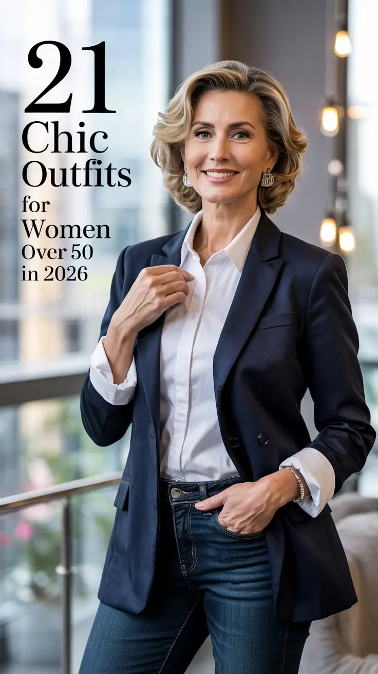 The pieces I like most are that they are a good fit between Casual and Elegant. The navy blazer provides structure with the help of the shoulders and forms a long vertical line, particularly when it is layered loosely over a dark-colored tee. The flaired jeans are just long enough to be taken right over the top of the loafers, and it therefore presents the same effect of lengthening of the leg that many of us desire. The crossbody fitted to the front is small making the look practical and hands free which is highly realistic life friendly when it comes to outfits used in everyday life. Little jewelry and sunglasses allow the relaxing forms to speak.