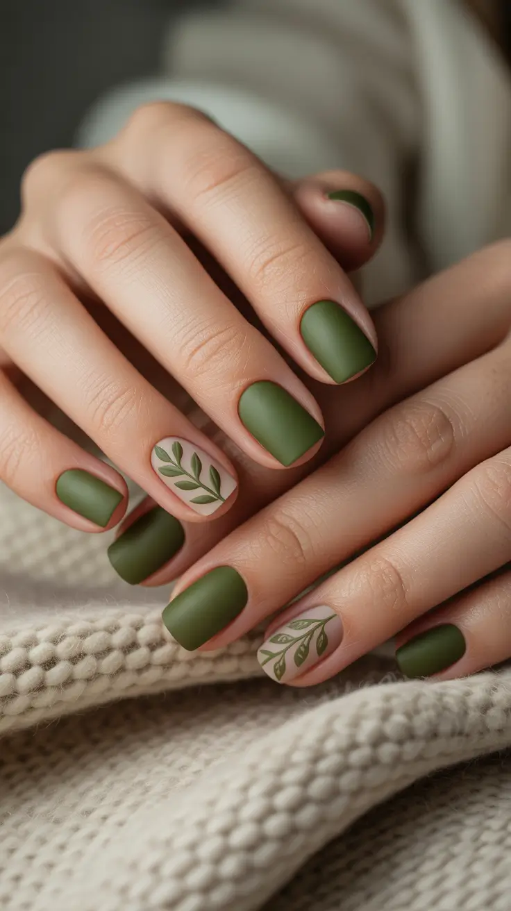 This soft matte sage over a clean cut, softly squared short set is like a deep breath. I adore the fact that the creamy neutral base on two nails allows the fine work of olive-leaf to breathe and the green appears richer because of the contrast. The shape is sensible and refined in workweek wear, and the finish appears like cashmere – cool and soft.