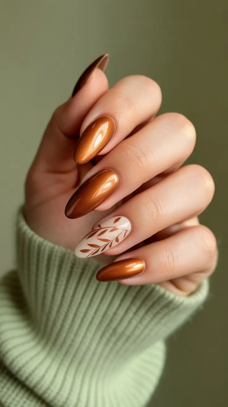 Most nails are molten copper shimmer with a single creamy accent in the form of delicate leaves and this is pure fall romance. The long and slender shape of the Almond figure, without going to extremes, plays with the light with each gesture. It is celebratory enough to go out to eat, but casual enough to have a Monday morning – the perfect fall nail art design of November.