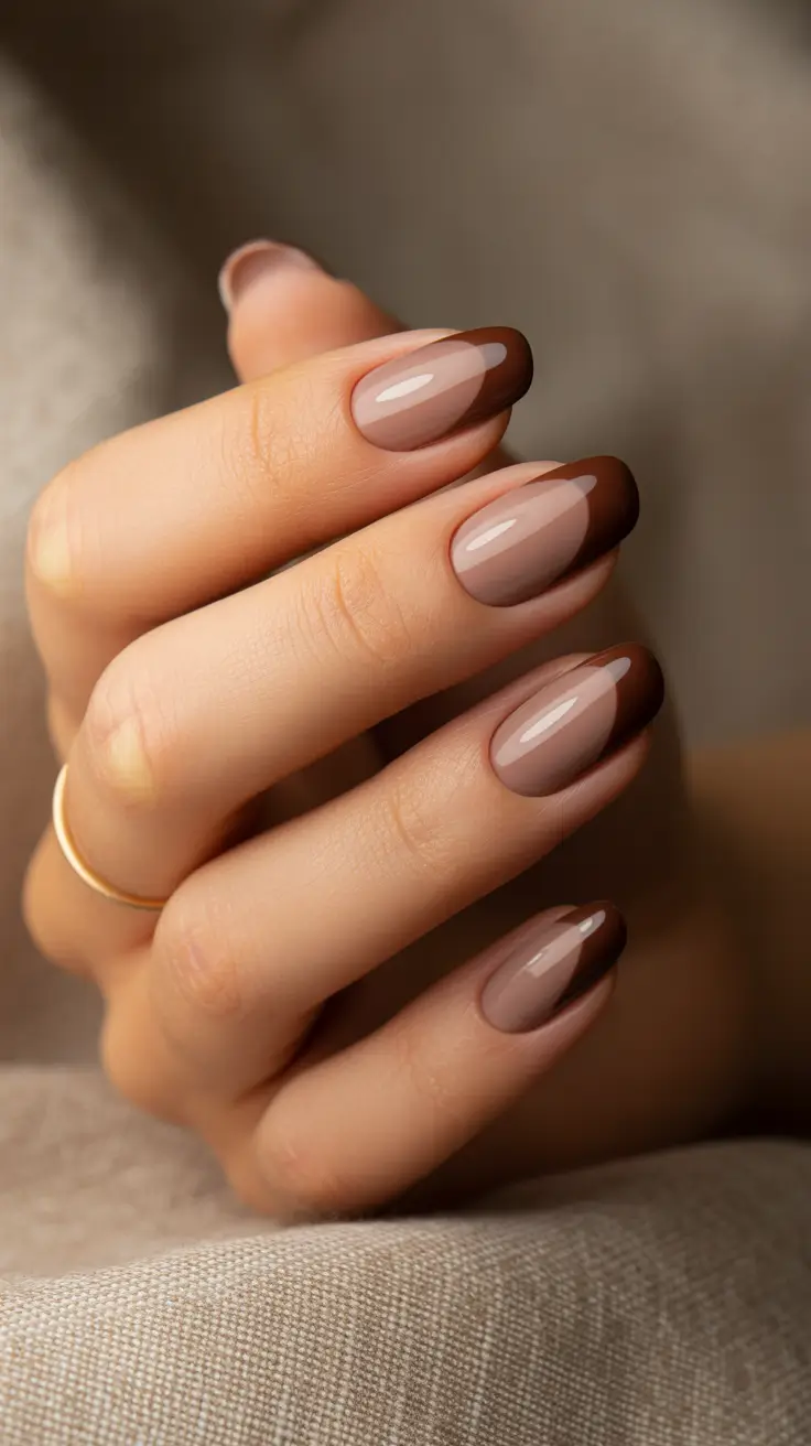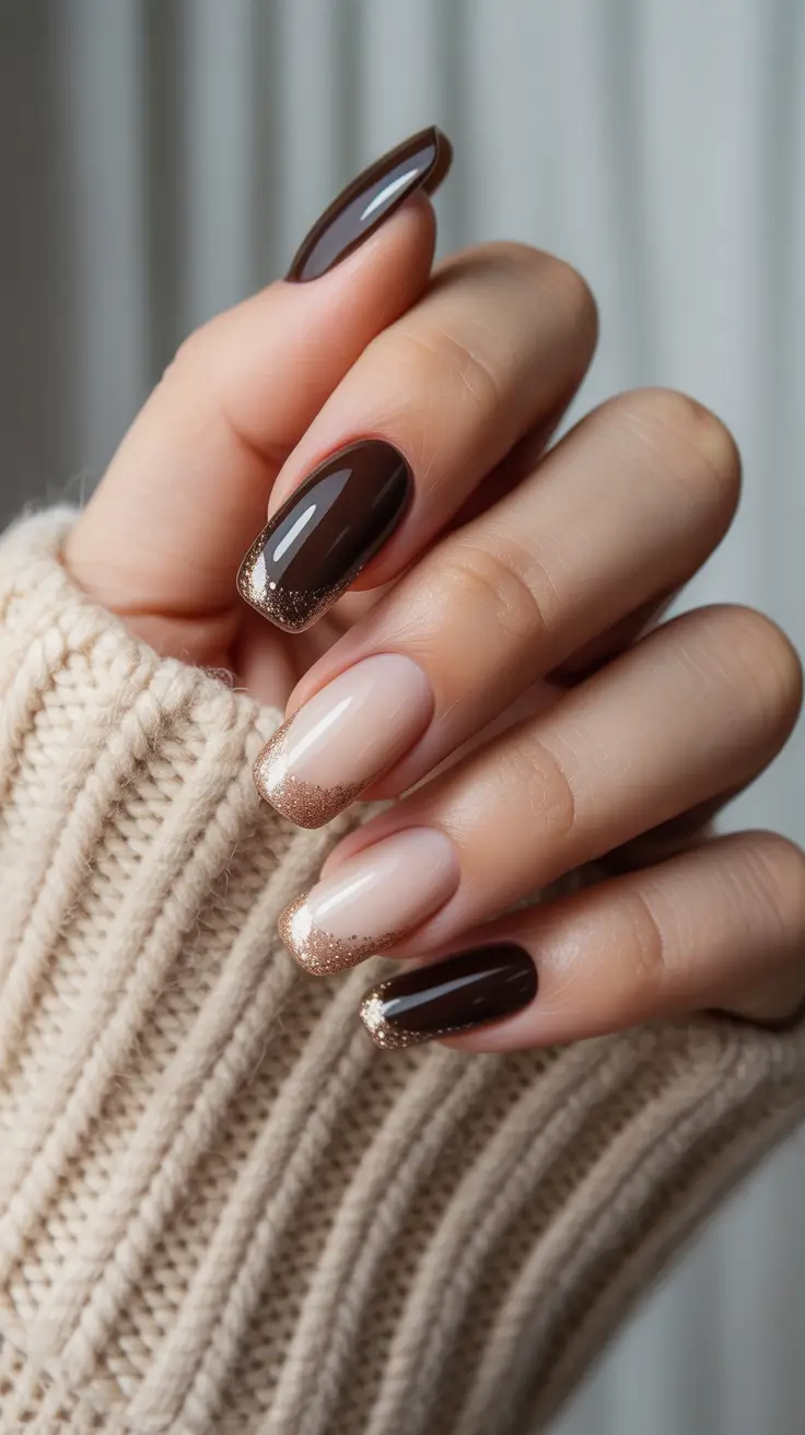 The look I create when I build it is using a cocoa gel (think OPI GelColor “Espresso Your Inner Self”), a sheer gel in a bottle to use as the base nude, and a fine rose-gold glitter gel to use as the micro-sparkle. An elastic ultra-glossy topcoat smooths out the glitter line making it feel smooth, not gritty.