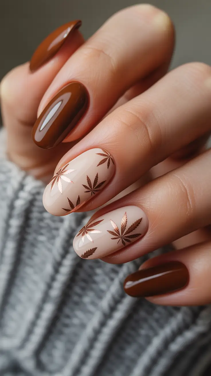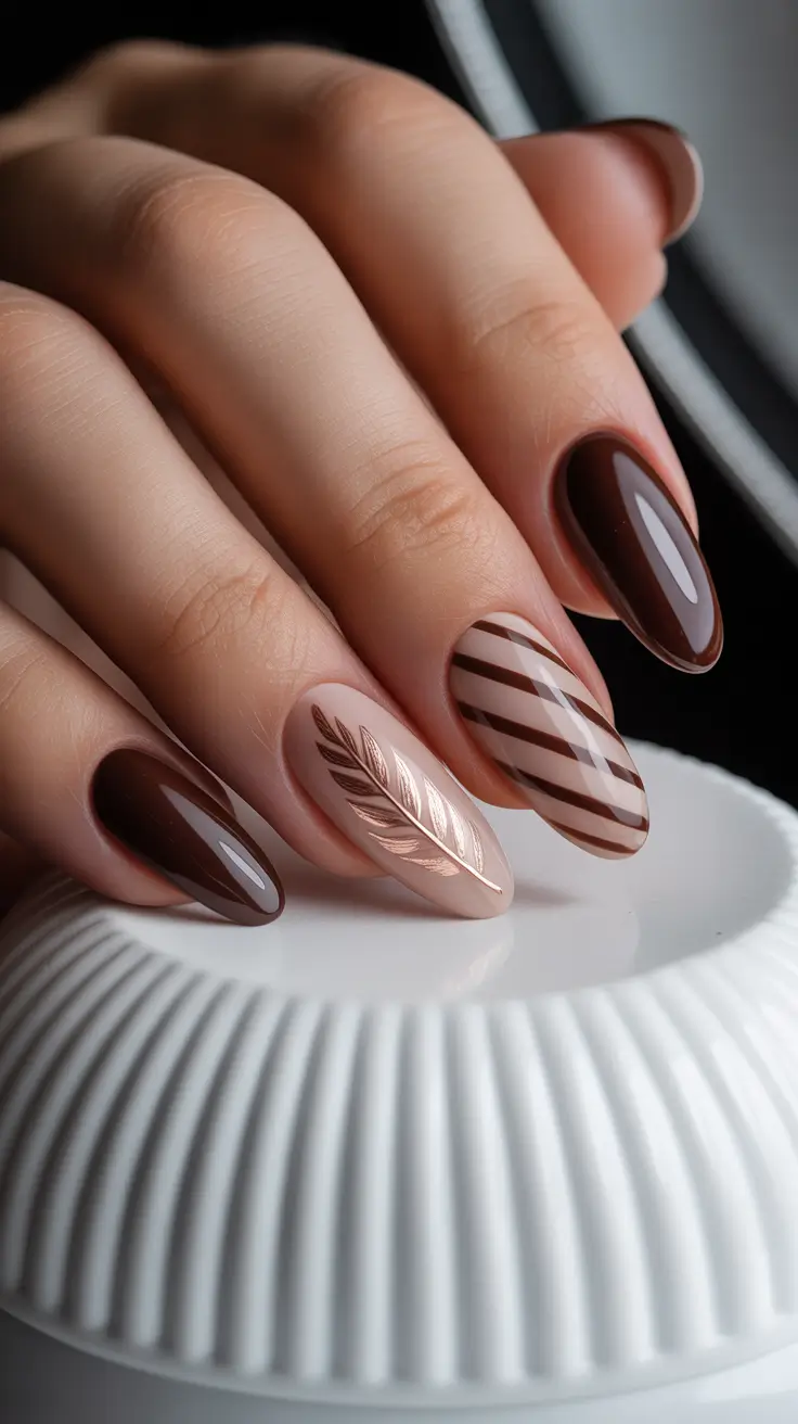 Shiny almond shape nails in glossy mocha are overlaid on a creamy beige canvas with a rose-gold botanical and diagonally-striped accent. It is graphic and feminine simultaneously – it is a clean blend of an understated base and bold Art that translates to a high society outing in late-fall.