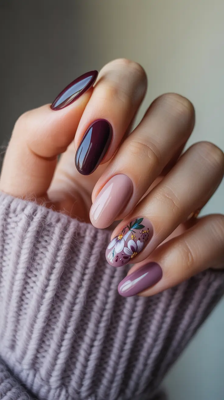 The strong wine and mauve palette is gently interspersed with floral overtones in a romantic allusion to the chrysanthemum season without lapsing into spring. It is a very shiny finish, which makes the berrys turn into evening-ready Burgundy glamour and at the same time keeps it down-to-earth enough to wear every day. This is your paradise in case you love color but cannot go bright in November nail art fall design.