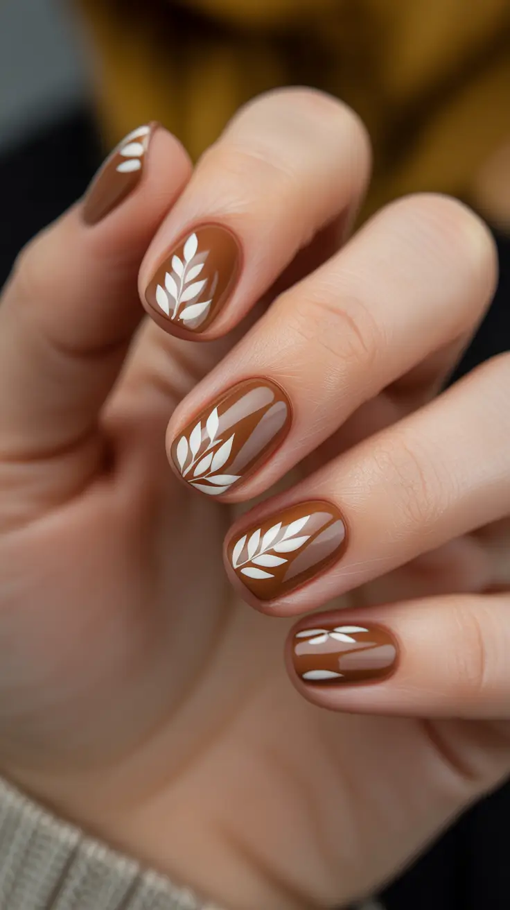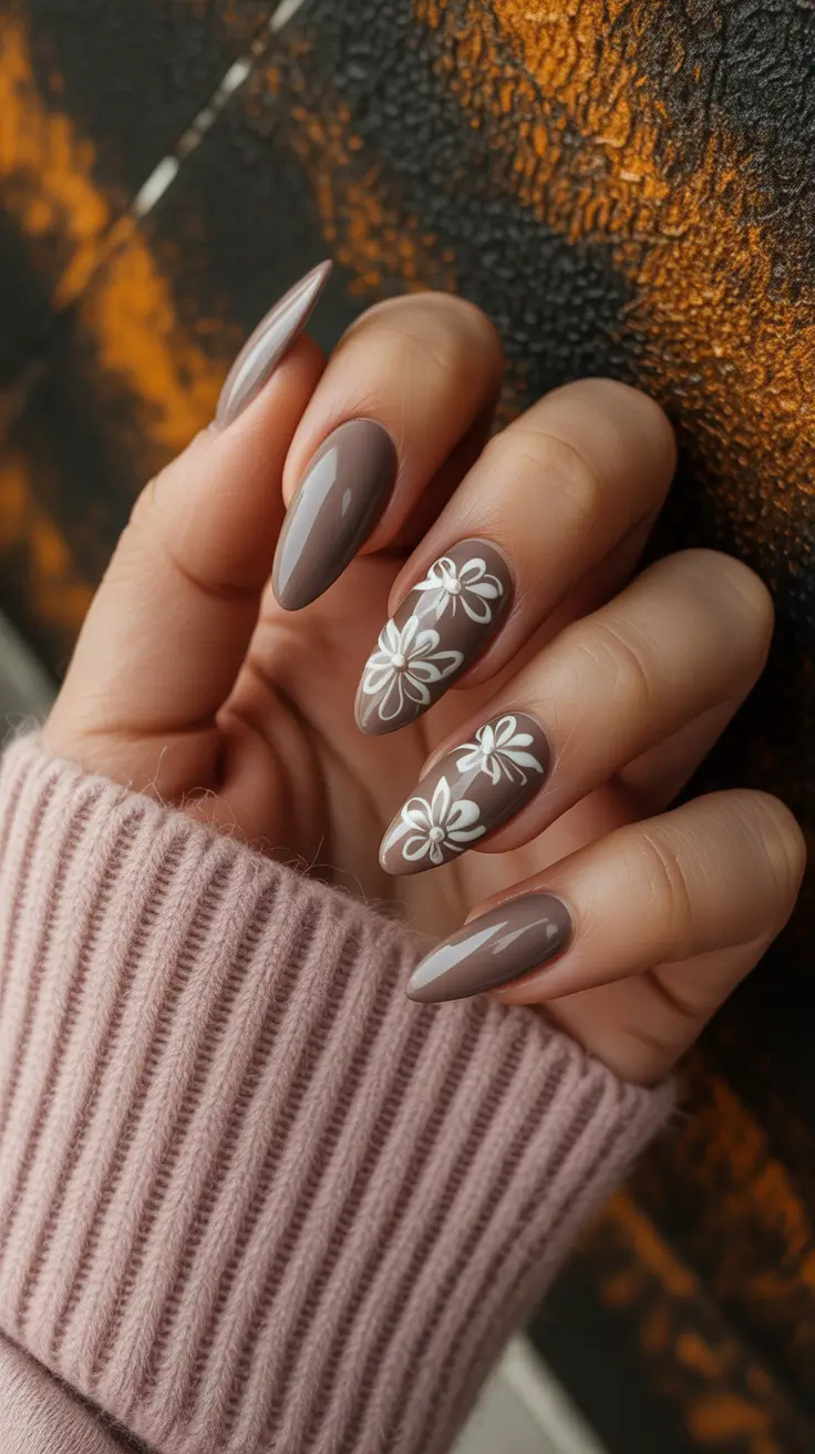 I am leaning towards a cool taupe base of mirror-gloss finish on an Almond shape – long but comfortable to wear – then picking it all up with crisp white floral linework that projects clean rather than cutesy. The palette is firmly within the Brown territory and, thus, it is a fashionable november fall nail design when one has transitional sweaters and trench coats on. The spacing of the petals is important here – a breath of negative space is what keeps the daisies light and airy, very early-November vitality.