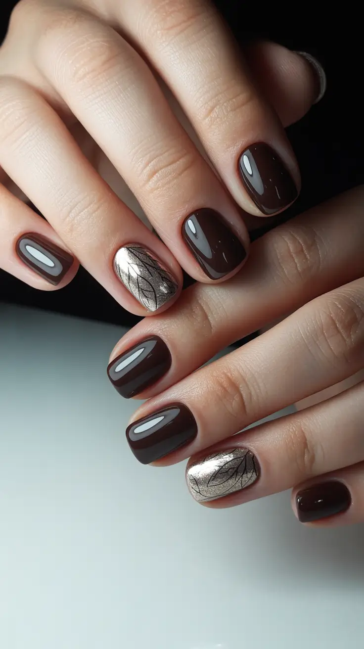 Shiny espresso on smooth medium Square nails and one shiny foil-leaf accent – the contrast is not dramatic, but strong. The reflection is caught in the mirror metallic and the deep Brown bottom holds everything in place even with jeans and trench. Should you be seeking Art that is understated on a work-friendly canvas, then this is your answer.