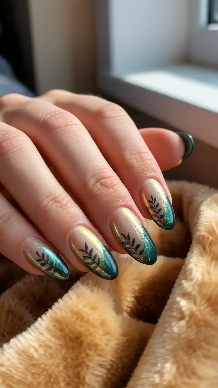 I have on a clear nude base which fades to emerald-green chrome at the ends – a gentle gradient, which fits an Almond form without appearing heavy. Slim black leaf patterns are ascending to the free edge to the center to ensure the appearance is crisp and seasonal. The reflective shift looks stylish in the early evening sunsets – a high end nail polish that does not weigh down on the hand.