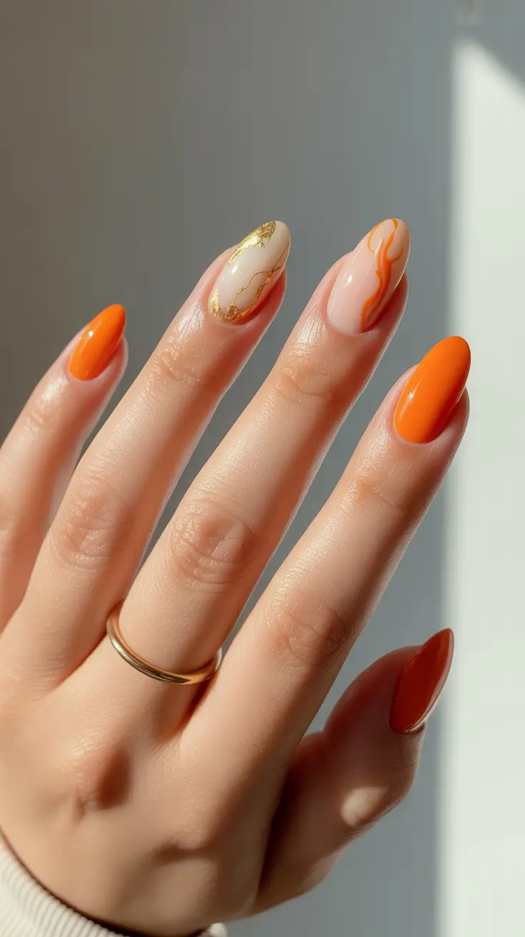 In this case I strike a balance between fat tangerine solids and two creamy metallic gold-veined nails and one orange wave detail – elegant and vivid. The figure remains long Almond, making the solid color soft and allowing it to be worn even after a weekend. It is a happy November fall nail design when the daylight is limited and the wardrobes are neutral.