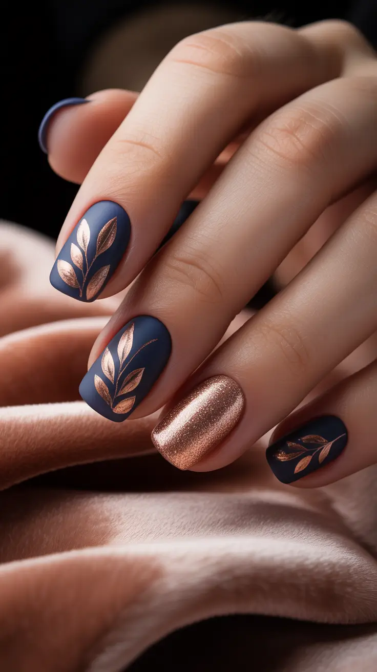 Copper leaf sprigs are shinier on a plush navy-matte background like moonlight on silk – and an entire metallic accent maintains the luxe palette. The ratios are more Short and softly Square and these are perfect in typing every day and yet leaning towards the dressy side. Blue for fall? Definitely – it is contemporary and it goes well with gold.
