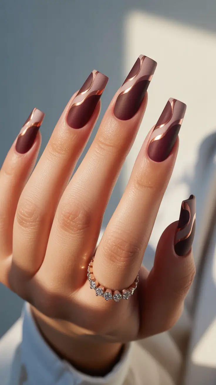 The base is a deep wine, matte satin and the tips are swept with molten rose-gold. The long figure is theatrical – party-ready. The undulating positioning is a contemporary, sculptural version of a French tip that does not go literal.