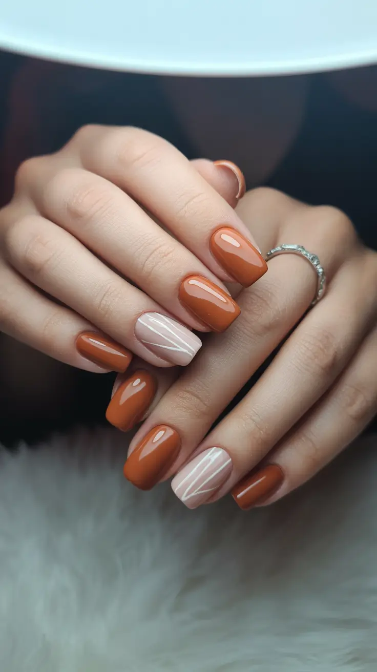 Imagery Tones glossy Burnt orange on most nails with one neutral accent described by a small geometric striping – some spice, some cream. The figure is trim and utilitarian – medium Short and mildly Square – ideal with keyboards, cooking and weekend expedition without sacrificing color. The variability makes it vibrant when the sun sets early and scarfs are required.