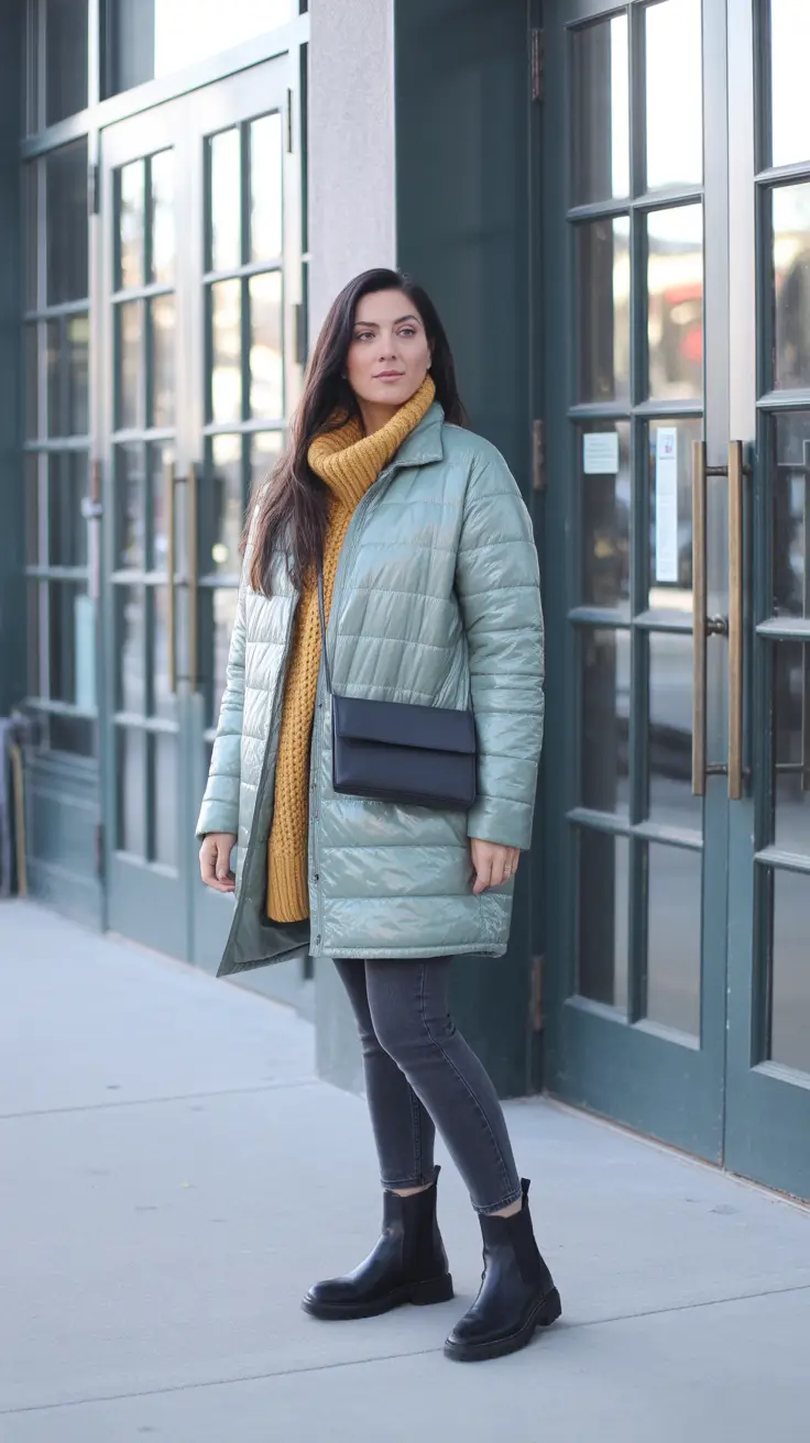 I pull on a seafoam quilted puffer when the wind roars, then loop a marigold funnel scarf for a jolt of warmth and brightness. Charcoal skinnies and polished black Chelsea boots round out the look. The coat’s mid-thigh cut traps warmth at the core, the scarf frames the face with sunshine, and the boots laugh at slush. It’s how I clock the miles when errands call, and it adapts effortlessly to campus life when the bell rings and the doors swing open.