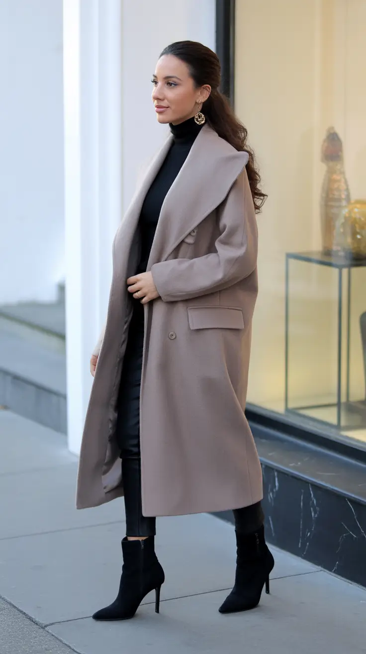 I’m a fan of a shawl collar—it adds softness—plus a turtleneck that gently hugs without too much squeeze, and a sleek skirt or skinny pants that are held steady by a reliable heel. Just like that, you have classy desk-to-dinner workwear. If you’re dressing for pregnancy, swap in a rib-knit midi with a comfy waistband; the taupe coat still provides elegant draping.
