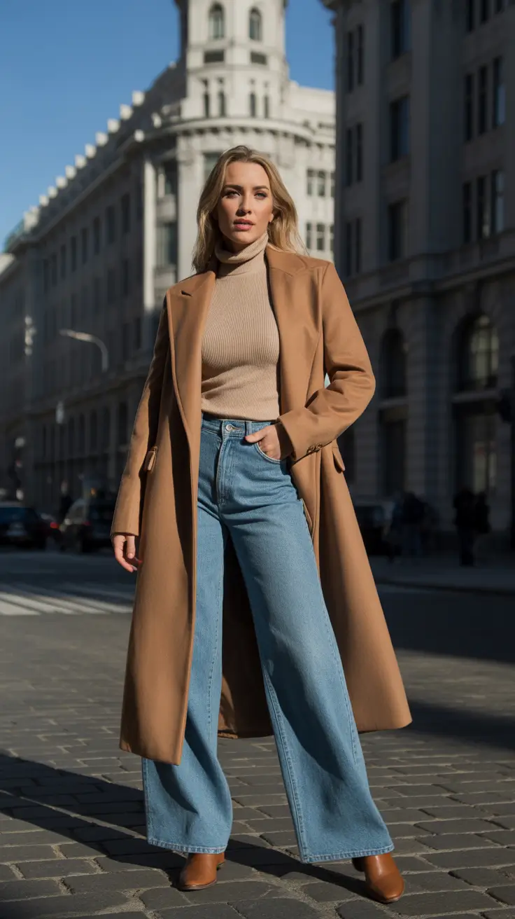 A fitted camel coat over a ribbed beige turtleneck, high-rise wide-leg jeans, and almond-toe boots delivers that sleek-but-classic vibe that never clashes with my day. The coat’s straight cut holds the volume of the denim in check, while the warm neutral top keeps color and cozy vibes in sync. It’s a clever nod to fall winter outfits casual that can still pass in a meeting.
