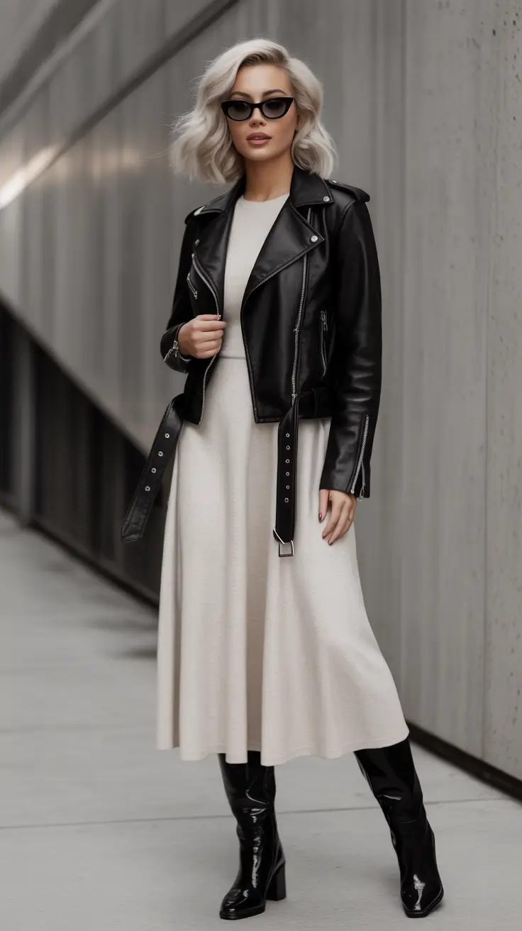 Picture a cozy ribbed turtleneck dress, bronze caramel coat that could make any pumpkin latte blush, and knee-high structured boots. That’s the vibe I give my friends craving to keep their legs toasty while still having a silhouette to swoon over. Vertical ribs stretch just the right way, the coat hits with the authority of the class president, and the sleek brown knee boots act like the punctuation mark that sticks the landing. Brunch, quick trips to the market, or any daytime plan needing oomph? Yep, it’s the outfit that never says no.