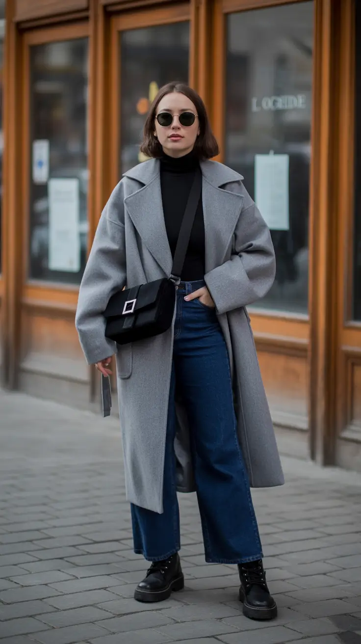 A structured slate gray wool coat over a black turtleneck and deep blue straight jeans is my easiest cold day power move – neat lines, zero fuss, maximum warmth. Grounding it with chunky lace-up boots and a compact black crossbody makes the silhouette sharp and city ready. Sunglasses give that silent attitude I love for Nyc mornings – this is pure winter fashion inspo classy for real life in 2025.
