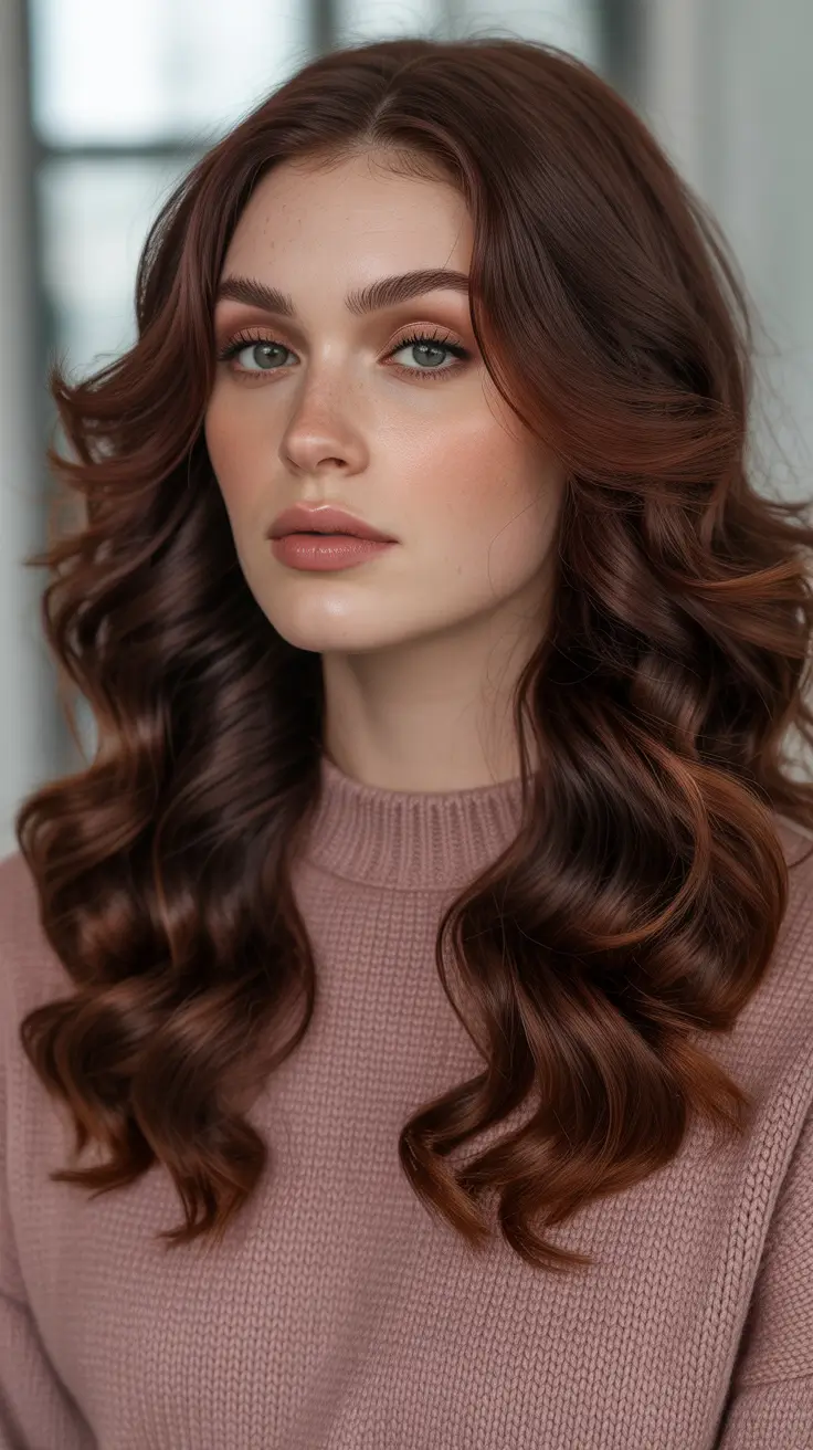 The base here is a smoky chestnut with auburn warmth lifted through the midlengths and ends, finished with long side-swept layers. It’s understatedly glamorous, with depth at the crown and glow through the waves. If you need soft, refined dimension under a blanket of gray, this is winter auburn hair color brunettes with no brass.