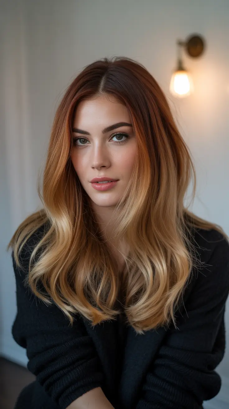 My POV – this the most “I can do this today” auburn. It pairs nicely with “cool girl” makeup and winter whites and it grows out soft if you’re color shy. If you’re starting from darker brunette. If you’re starting from darker brunette, ask your colorist for a warm brown base with auburn glaze and just the last two inches lifted – a whisper of color, but it reads luxe. If you need a little more depth for January, add a root gloss one level deeper. It sharpens the contrast so the caramel tips feel intentional, like the last layer on a great winter coat – small switch, big energy.