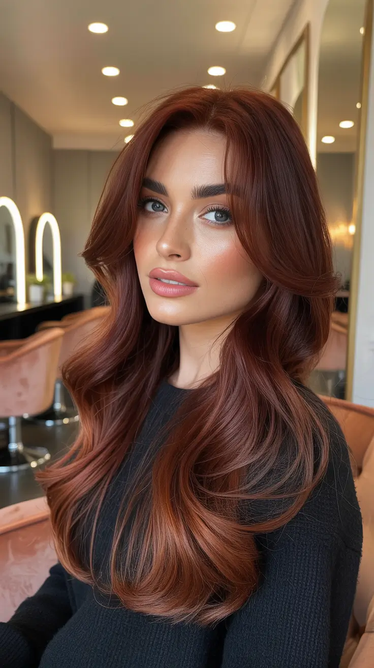 This style combines soft copper auburn lengths with airy curtain bangs, allowing light to graze the cheekbones. Youthful, romantically soft, and ideal for a modern twist on the classic long layers. The tonal range comfortably sits within the Winter auburn hair color ideas bracket: bright but tamed for the colder months.