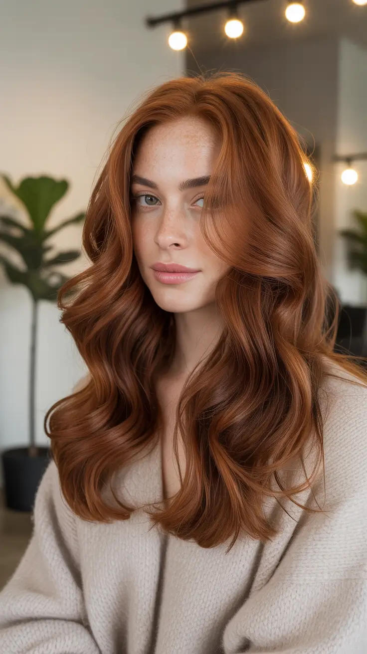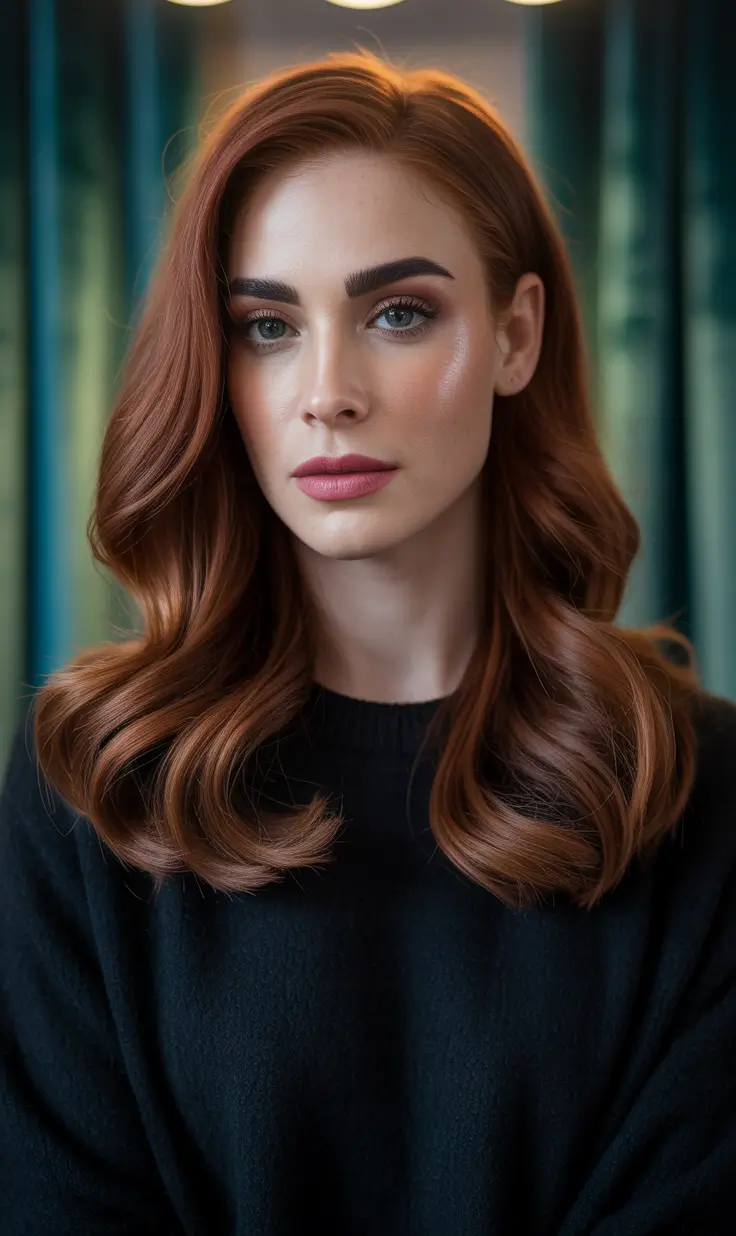 I’m leaning into a honeyed copper auburn here – bright at the mids, softly rooted, and finished with loose curls that skim the collarbone. The curtain part keeps the face open while the ribbed plum cardigan over a black base layers in winter depth that makes the copper sing. If you want winter auburn hair color brunettes that reads natural in daylight but glows at night, this shade hits the sweet spot for Ideas for brunettes who don’t want to go full red, just softly sun-warmed in December.