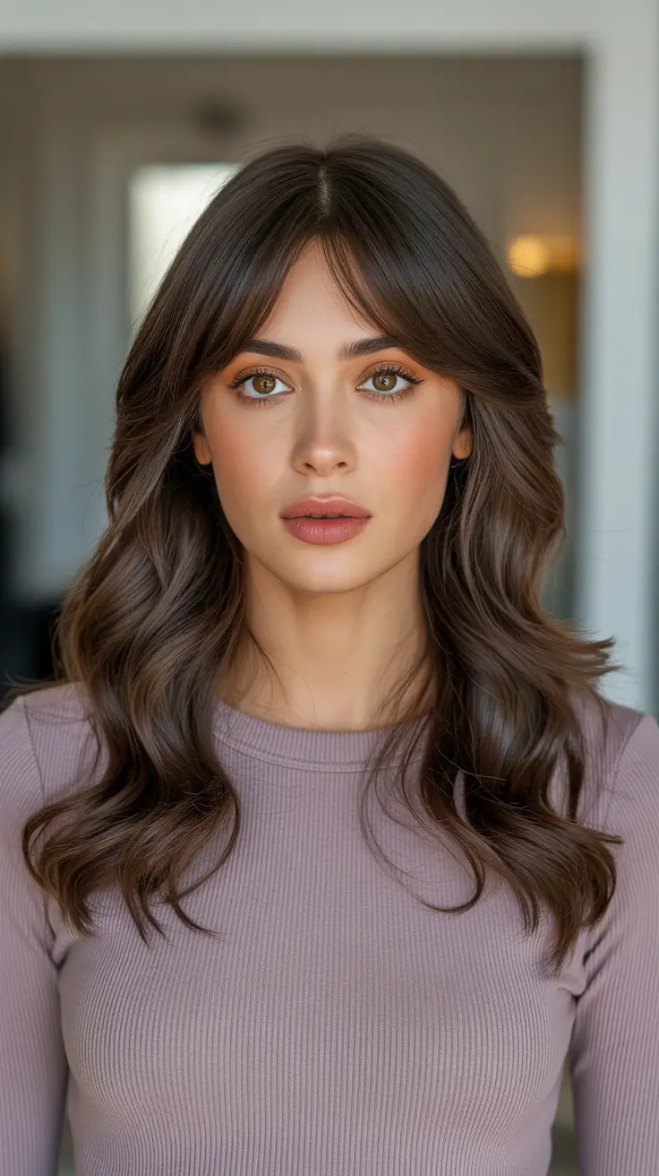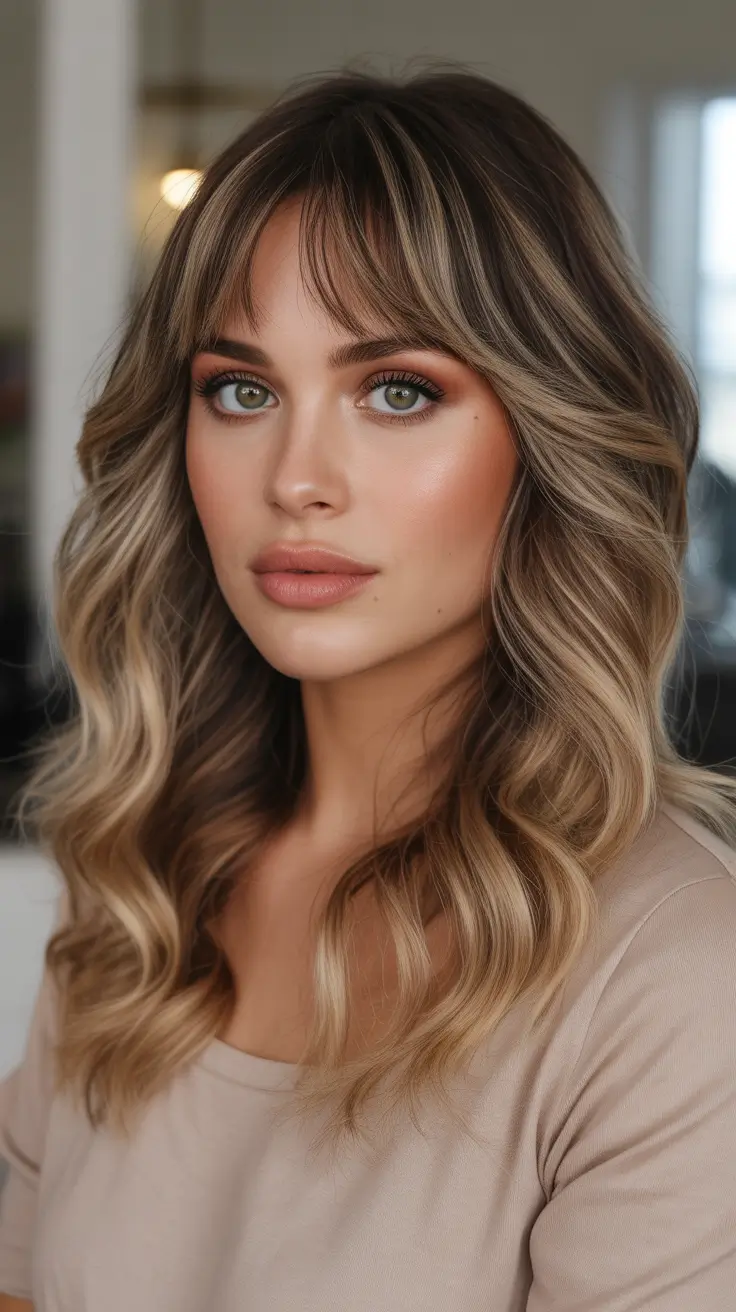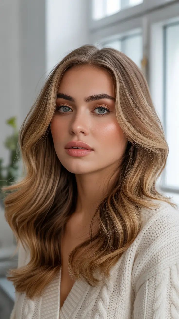 It is all about those pieces of face framing here – bright and not chunky – melted into a darker gold brunette foundation which is thrown down in long loose waves. The grey knit and light neutral makeup ensure that everything is minimal such that the hair serves as the accessory. It is an excellent example of hair color/style to consider to look younger without shocking hair cut. The sparser ones are precisely at the point where the light hits thus giving a general effect of soft and dimensional as well as very 2026.