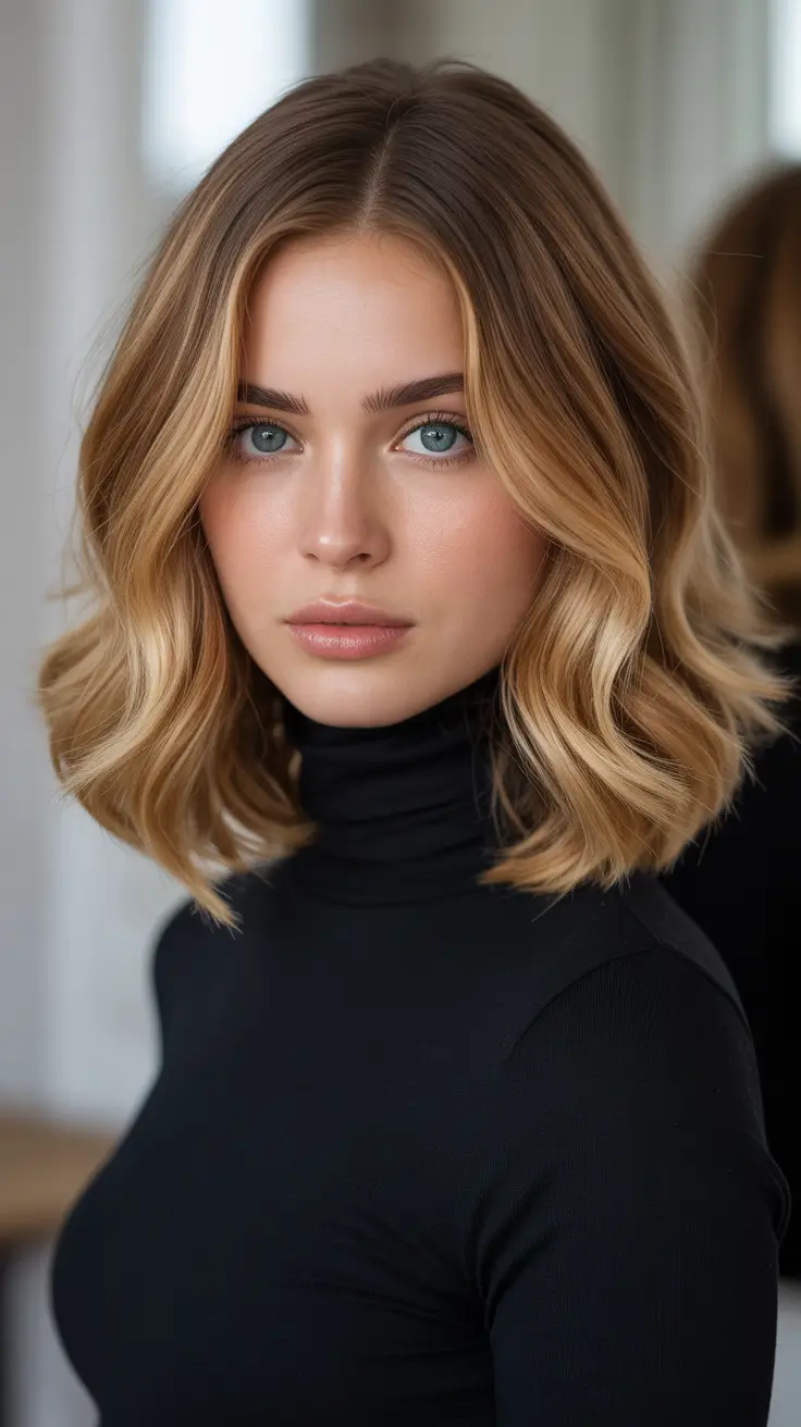 This is a smooth-on-the-shoulder lob of a classic shoulder-skimming cut, with soft, warm golden highlights, which illuminate the front part in a gentle effect. The bottom is tilted to a balancing and natural blonde, and the newer pieces near the face are brighter and are a slight effect, a spotlight that makes the skin healthier and more alive. It is styled in a smooth black turtleneck, which makes it a true example of