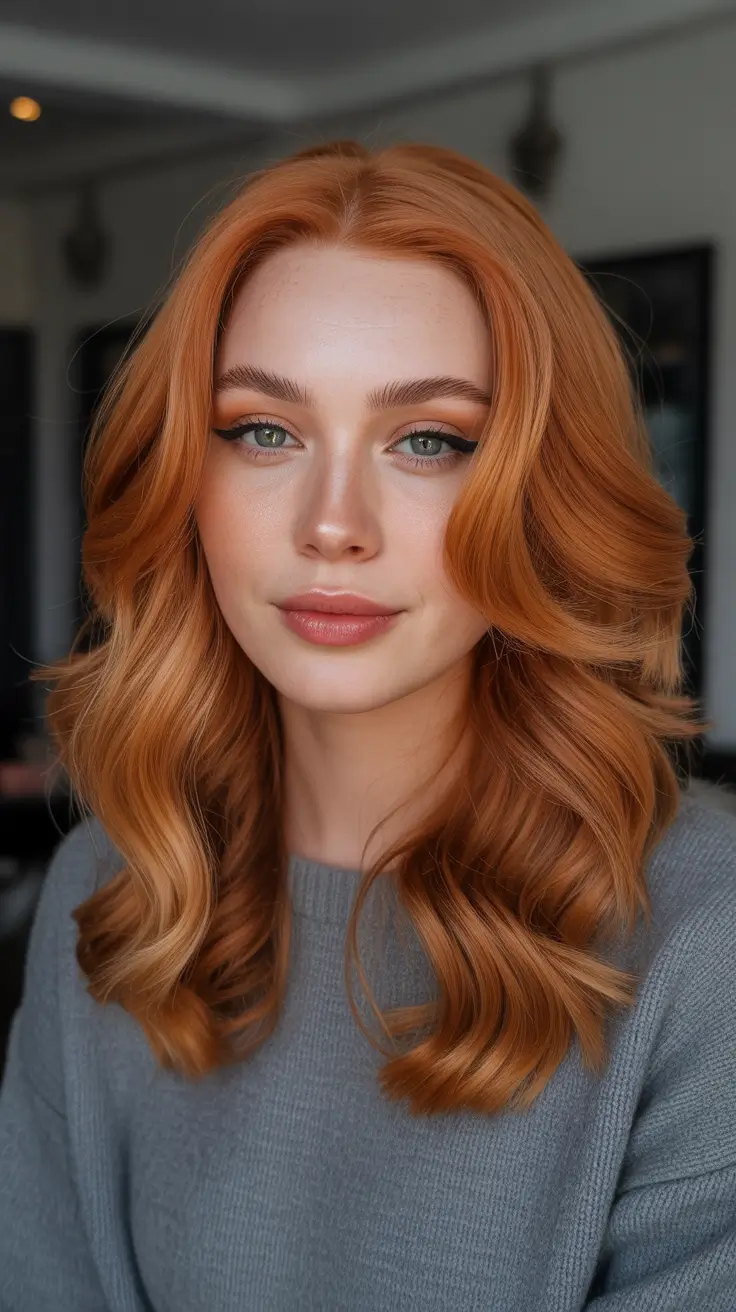 I adore the curls of soft copper on curls as they automatically cause warmer and livelier skin almost like in-built blush. The color is between the strawberry blonde and the regular ginger-colored shade and is warm enough in the golden hue to reflect light in each braid. On this lengthy, stratified, the spirals have a springy and young quality and the warm cream knit contributes that energy of weekends at home and yet gorgeous. To all those in need of anti aging hair color to help them age at least one year slowly, this type of not too bright copper is so good the fair skin gets warmed, the blue or green eyes shine and the hair does not look dark and flat like darker, colder reds tend to do.