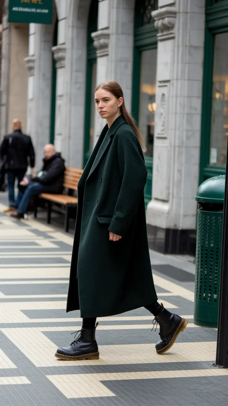 Here the star is a deep-green wool coat draping with weight and ease over an all-black base with lace-up boots. The color is rich but low-key, an intelligent alternative to navy. It’s urban, unfussy, and incredibly walkable – the sweet spot for Street style and Street style casual when the calendar says brisk commute.