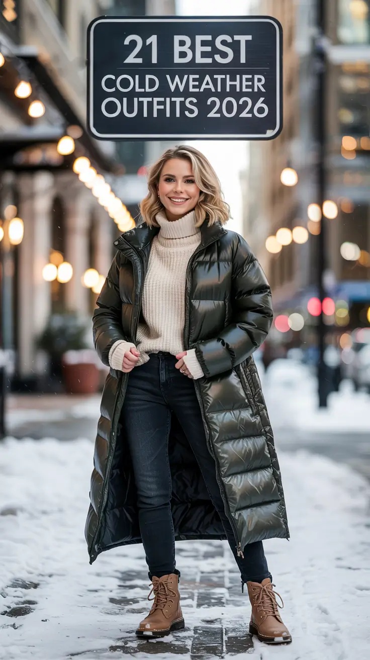 Were I updating this in 2026, I would make it fancy by use of accessories: perhaps a ribbed beanie, sleek earmuffs, or imposing framed sun glasses on sunnier winter days. Any shred of color on gloves or even a scarf would continue to provide a burst of Inspo without interfering with the minimal foundation. The beauty of a black puffer is that it makes the anchor which allows you to explore it nearly all day long throughout the season.