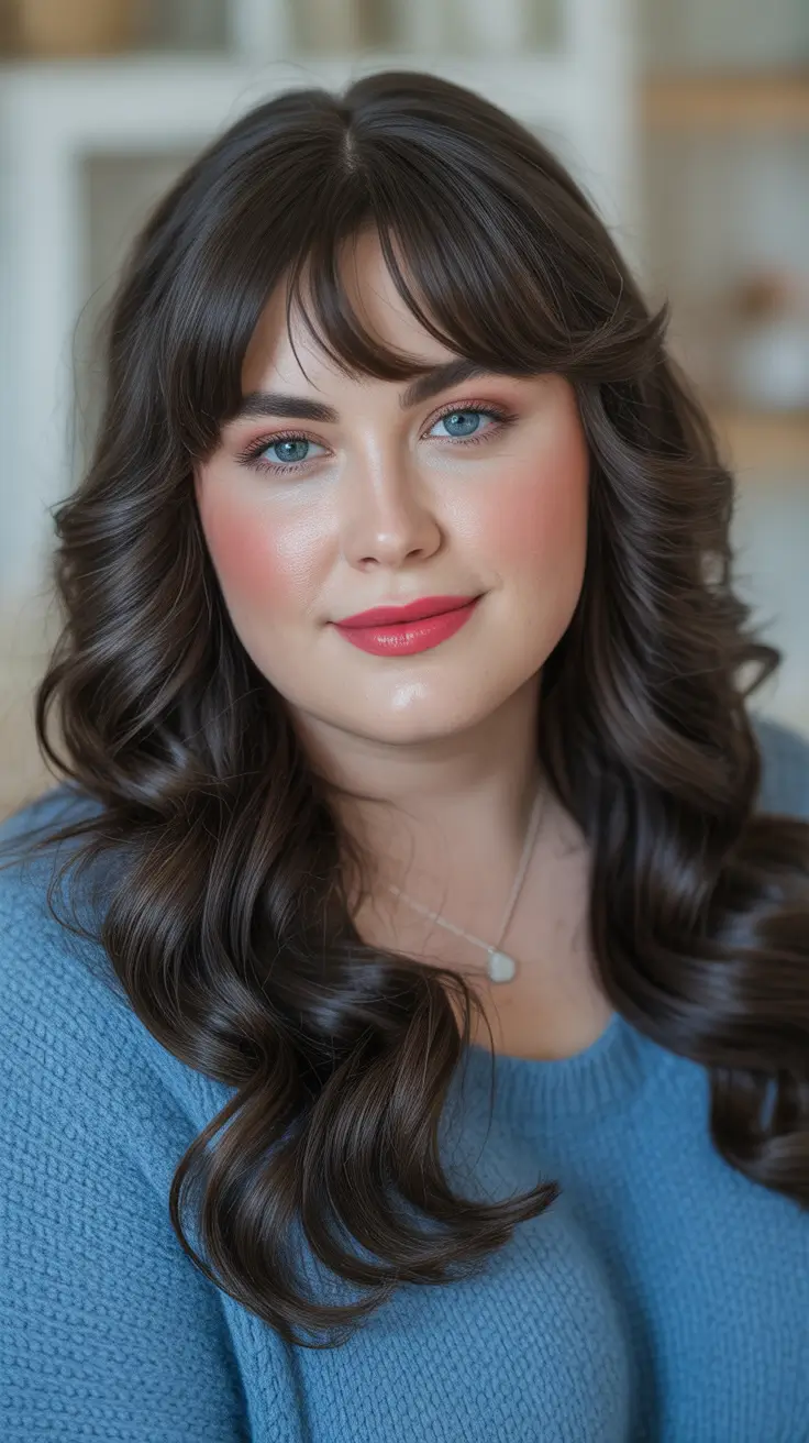 Reverie styled hair comes alive with flowing, soft curtain Bangs that graze the eyebrows. It’s a soft and dreamy take on Bangs if you adore movement and want to frame the cheek and forehead areas with a bit of grace. The layers through the ends help maintain fullness, so it’s bang-friendly for haircuts for plus size women and also bang-friendly for plus size women thin hair if you desire volume without that dense feel. The overall silhouette is plush and perfect for a winter date night.