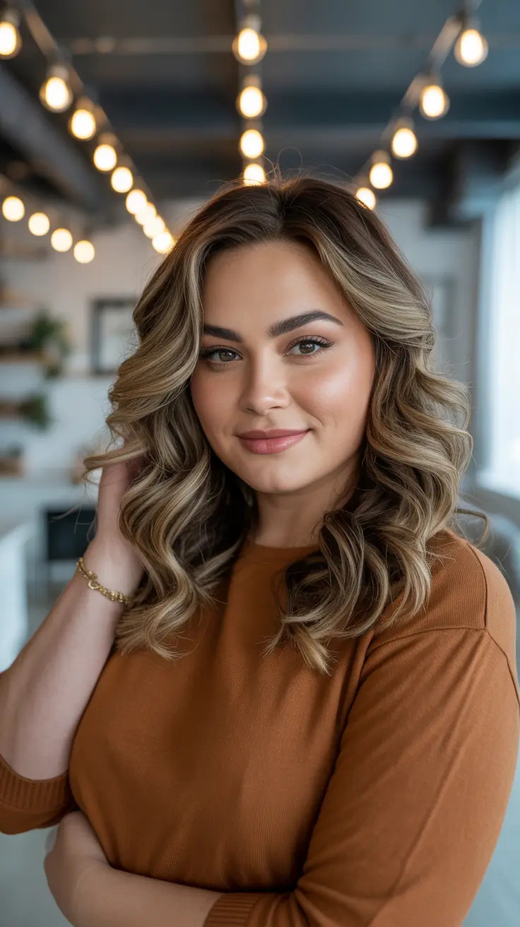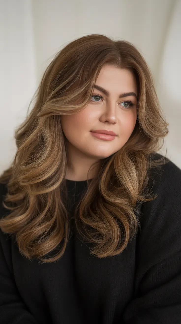 When I want pure glamour without any effort, I go long with glossy waves and bright money pieces through the front. The balance is kept with a center part, and the blended ribbon lights maintain it’s dimensionality. Perfect for haircuts for plus size women long hair or anyone needing that “weekend to work party” versatility. It’s the perfect adaptation of a grown-out Lob, with soft modern waves.