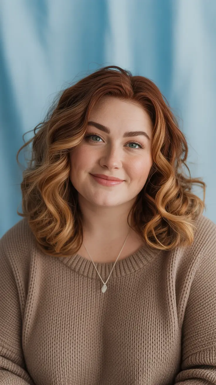 The photo above shows one of the most recent and equally trendy examples of a Toasted Honey Butterfly Layered Haircut featuring a face-lifted frame for plus-size women posed elegantly wearing a winter outfit complemented by a chunky knit scarf.