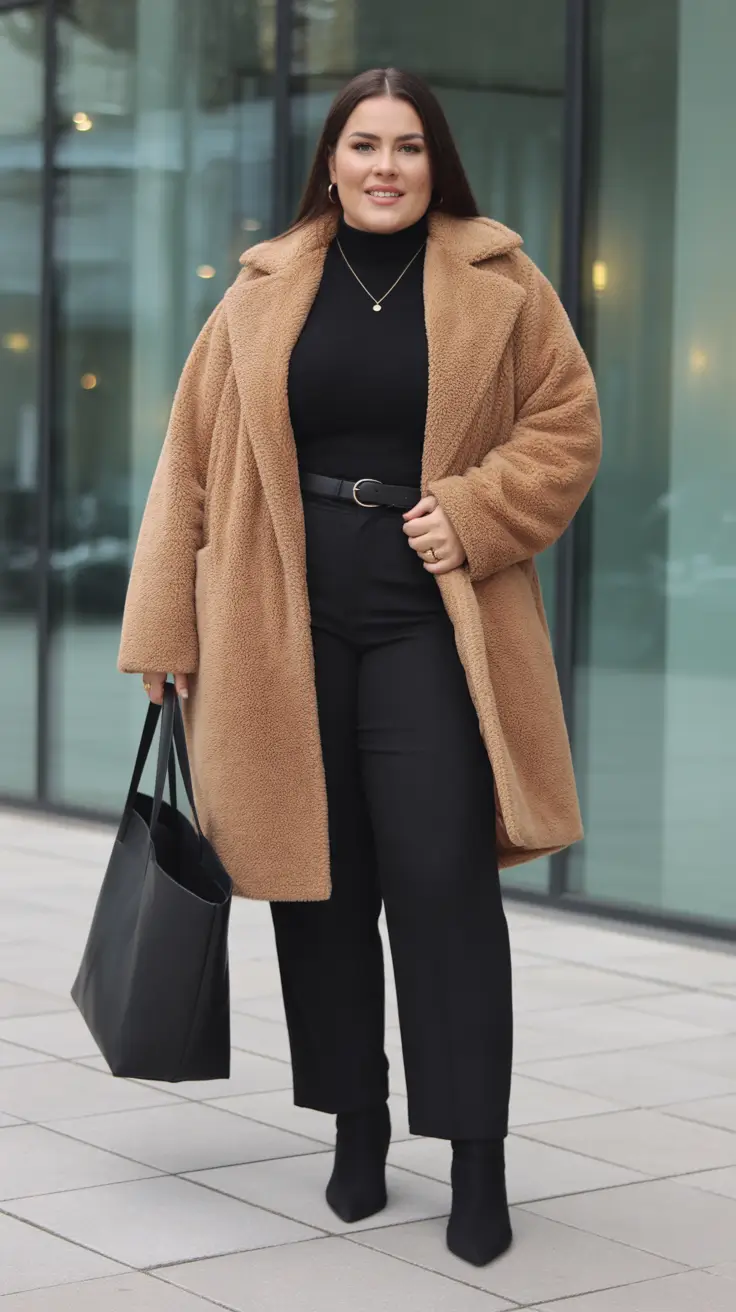 When the wind bites, I drape my teddy camel coat on an all-black outfit. Underneath, there’s a black turtleneck, tailored black trousers, sock boots in the same shade, and a structured black tote. The teddy texture pops, the monochrome underneath lengthens, and the belted middle shows my waist but still acts like a blanket. It feels like a warm hug but still brightens a freezing Tuesday—ready for work, cocktails, or errands—making it the go-to in my plus size winter outfits.