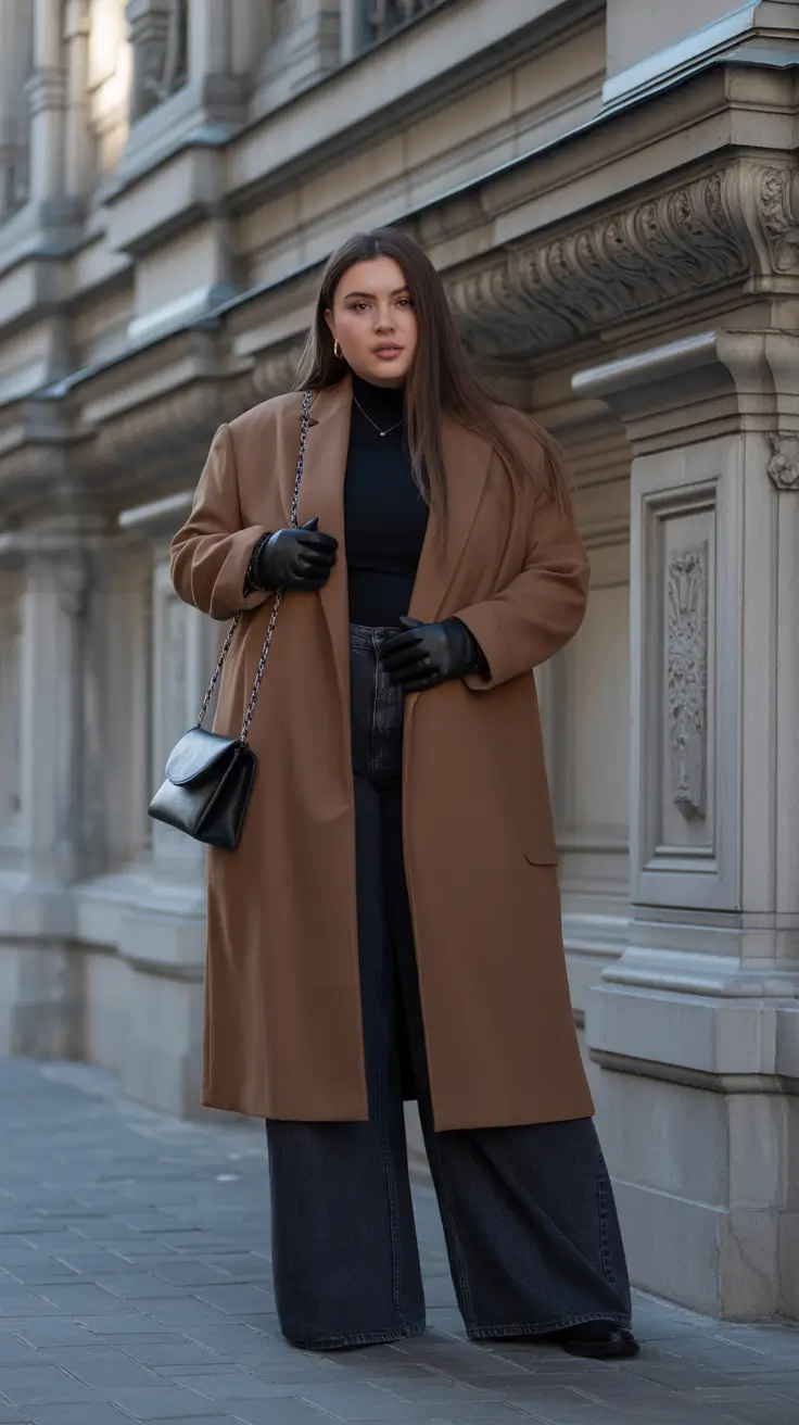 For meetings, I reach for the no-fail uniform: all-black base—turtleneck, wide-leg pajama jeans, the kind that puddles toward the floor, and tailored black gloves—then layer on the mocha coat that instantly smooths any sharp angles. Proportions stay long and elegant, the textures sing, and the overall vibe sits firmly in the plus-size, winter, professional category without feeling boring.