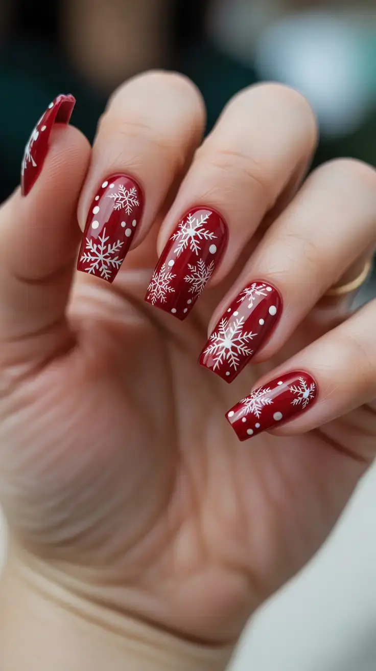 The cranberry bottom and white snowflakes make an immediate statement of a polished, not a kitsch piece. The silhouette is bent a little squared – ideal when you are fond of red christmas nails square with clean edges that type well. The shiny polish wearable on its top makes it luxe and tiny dots that create a flurry effect are cute Art, yet this counts as red christmas nails designs. I interpreted this as winter minimalism with a hint of elegance – its use is possible when you are going to a coffee shop or to carols, but not nothing less.