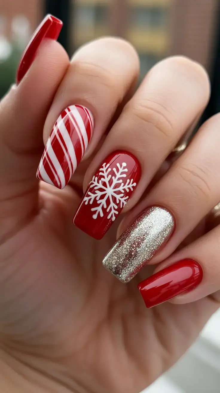 Abundant shimmering red and blunt white candy-strip and one over-sized snowflake is like party polish and yet reads polished. The lengtheness and neat squareness of the silhouette hit the gender box on red christmas nails square, with that champagne foil accent shaping the set with Gold and regulated Sparkly energy. And this is the happy medium between cute Designs and adult shine and just what I would prefer on my red christmas nails winter when wear is cozy yet elegant.