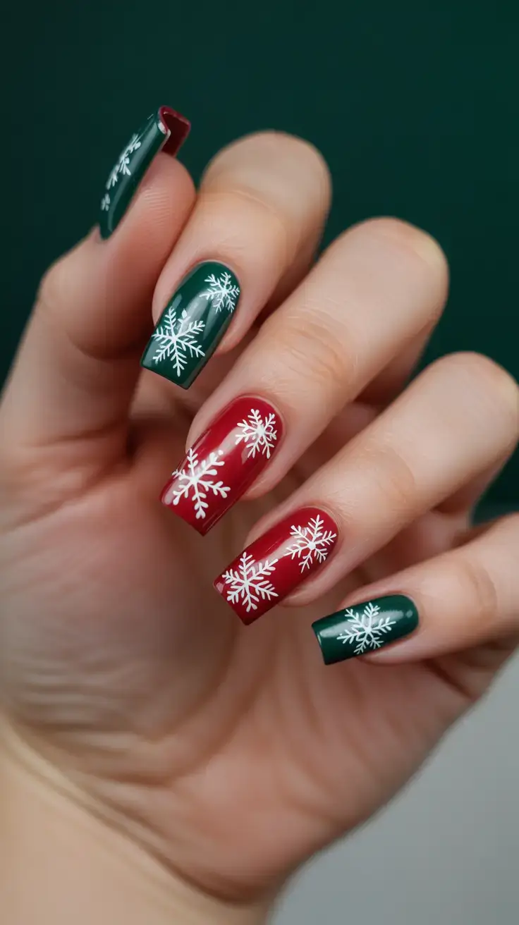 Dark green next to crimson red with sprinkles of snowflakes is as cozy as cozy as a cardigan around the fireplace and sophisticated. The medium length that is squared is convenient to work with typing – win in case you are fond of red christmas nails short or simply would like to have clean ends. The green and white details are highly contrasted to emphasize the season, not sounding loud, and the retesting motif seals the red nail trend design in the upcoming 2025 but in a very wearable manner.