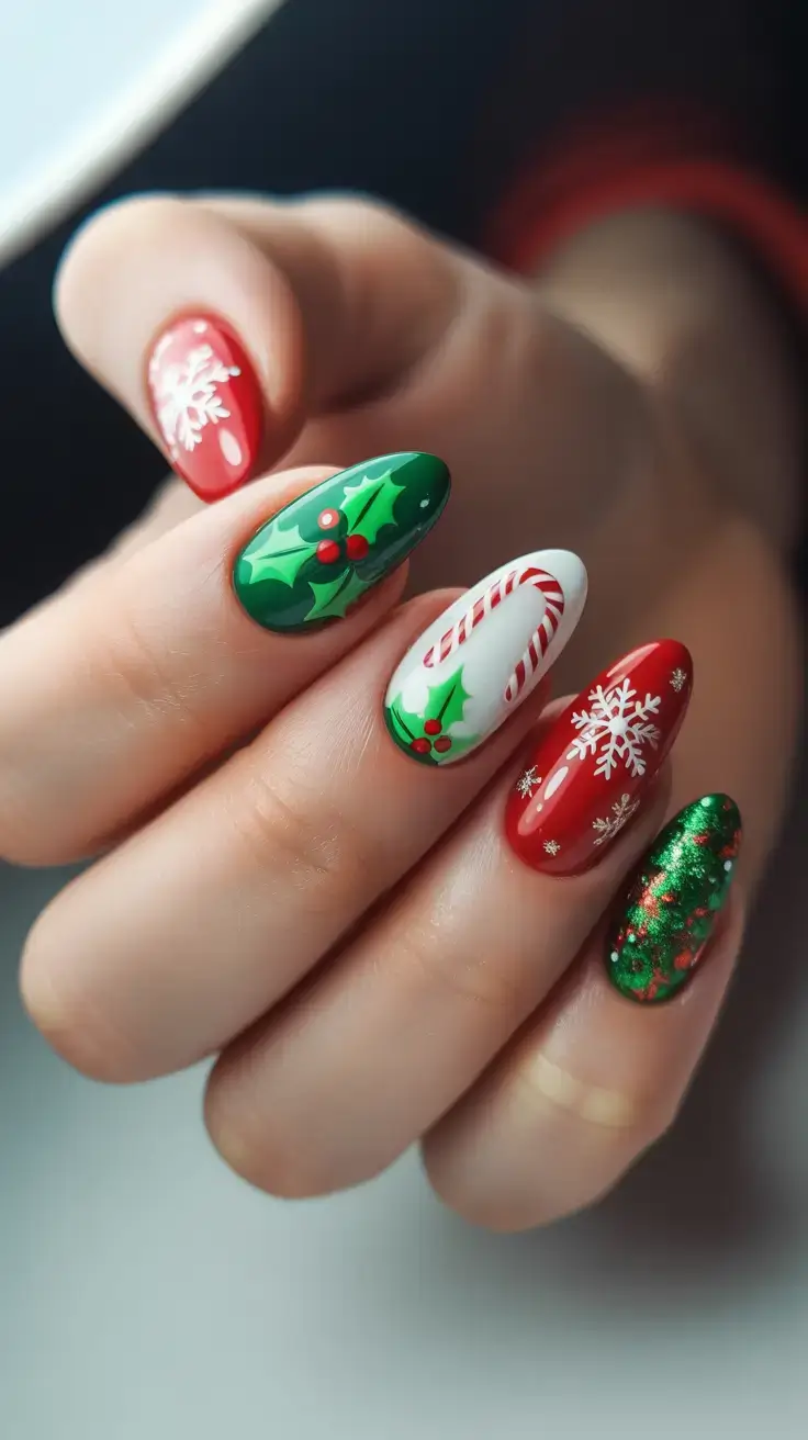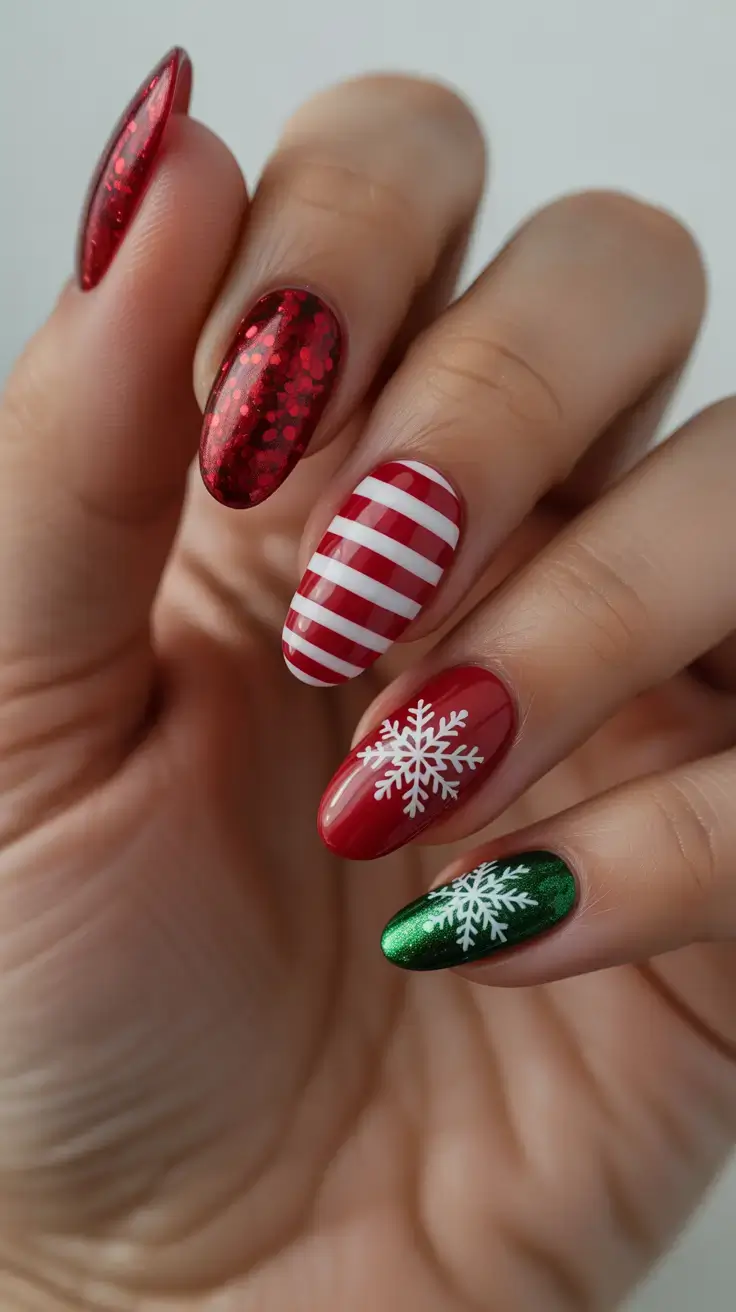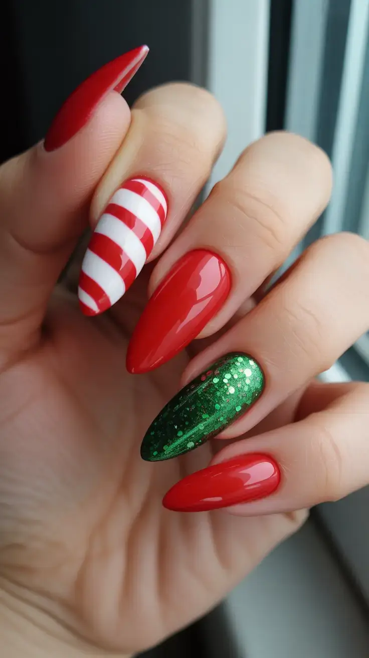 Almond Red with Peppermint Stripe and Emerald Glitter